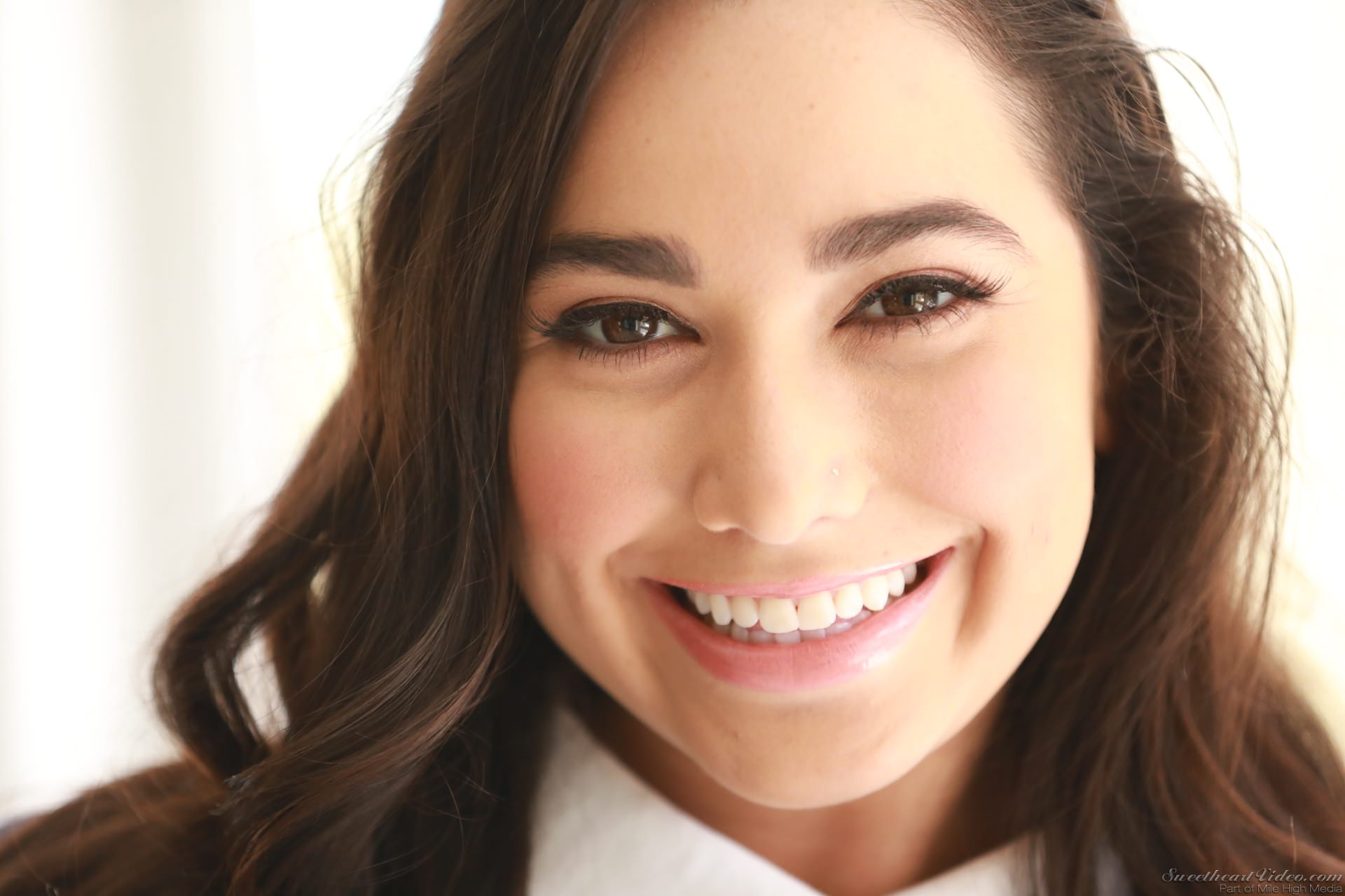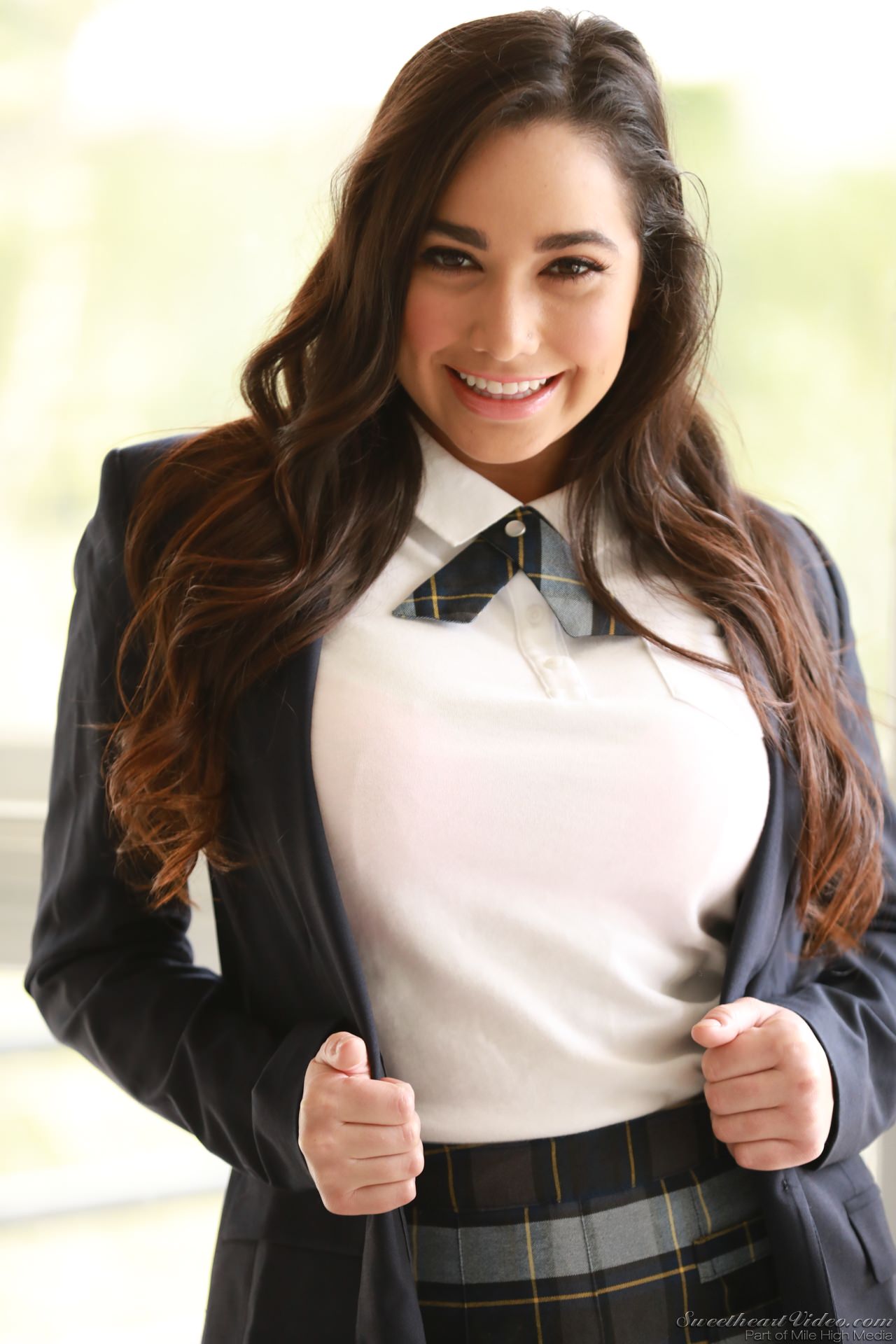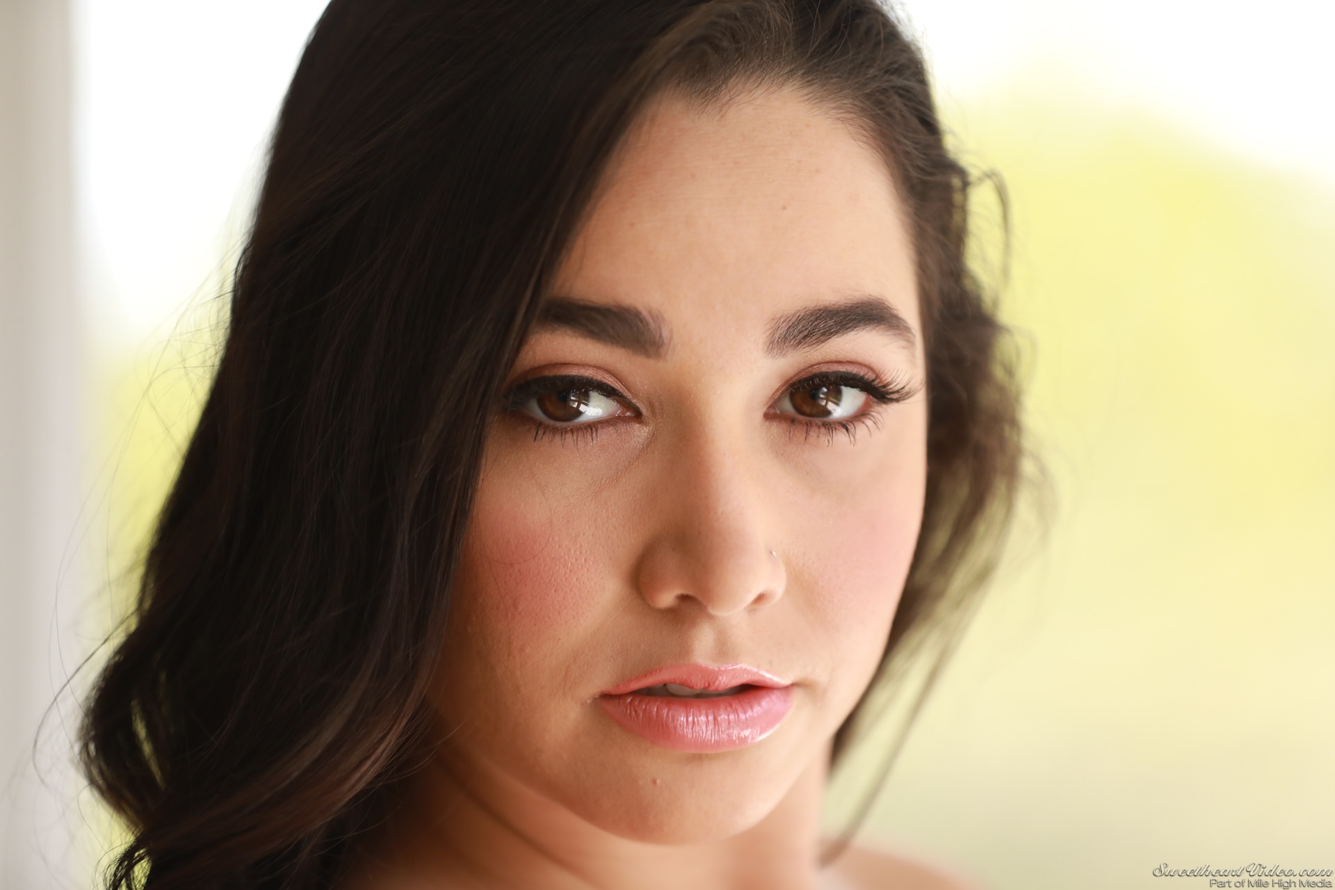 Кареглазая американская студентка с длинными каштановыми волосами и большой натуральной грудью Karlee Grey, снимает верхнюю одежду и демонстрирует свою стройную обнажённую фигуру. Молодая латинка с татуировками на теле и пирсингом носа, с улыбкой на лице показывает все свои девичьи прелести.