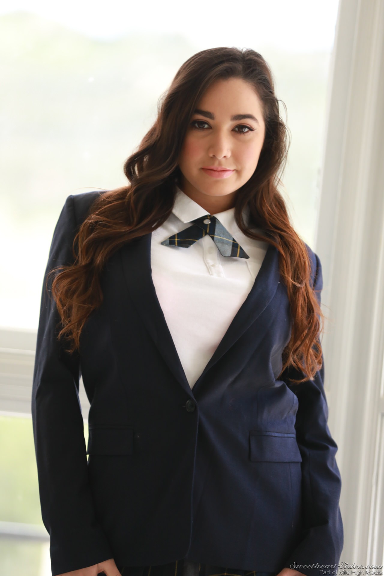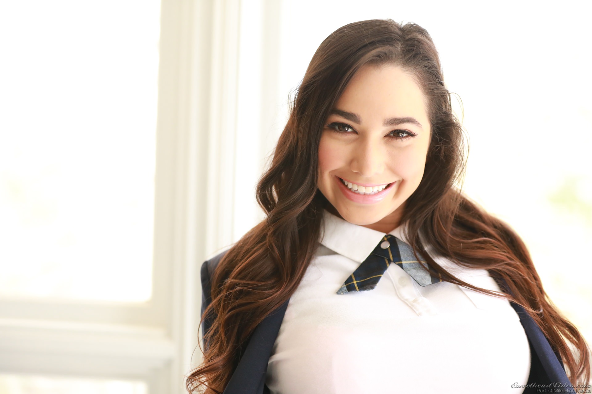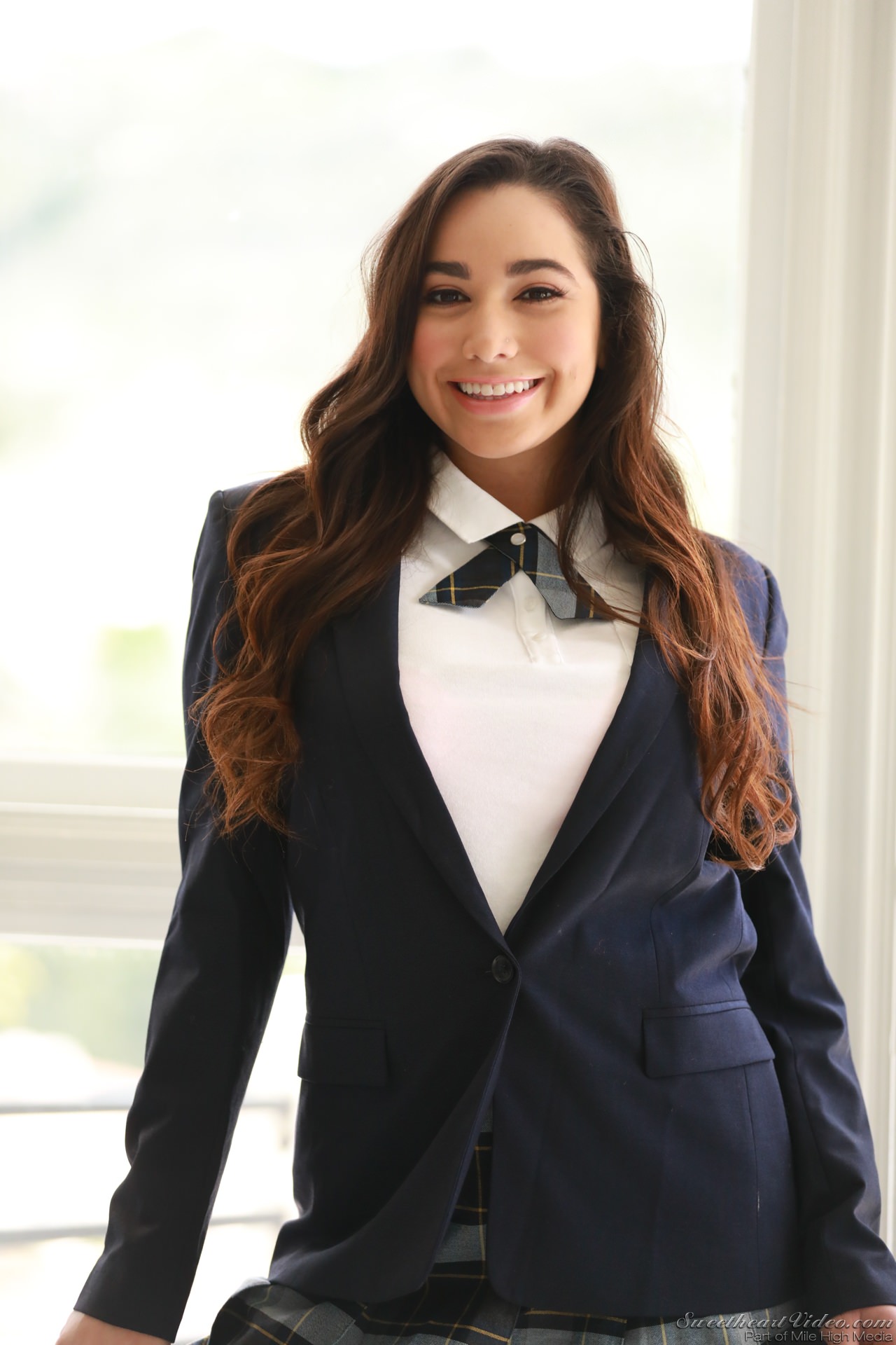 Кареглазая американская студентка с длинными каштановыми волосами и большой натуральной грудью Karlee Grey, снимает верхнюю одежду и демонстрирует свою стройную обнажённую фигуру. Молодая латинка с татуировками на теле и пирсингом носа, с улыбкой на лице показывает все свои девичьи прелести.