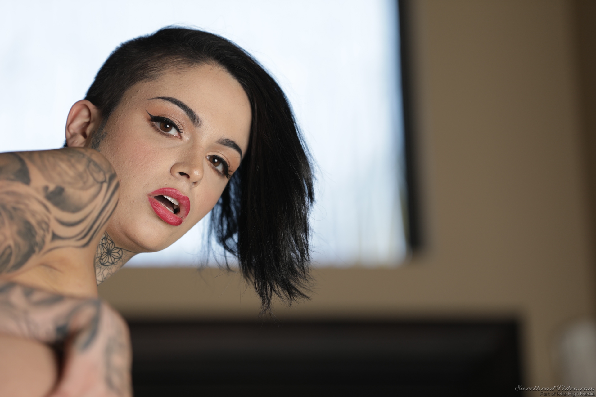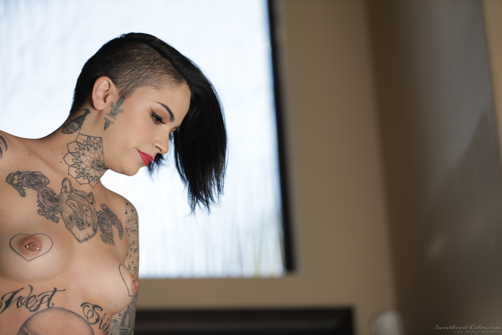 Развратная темноволосая девушка с татуировками по всему телу и пирсингом сосков Leigh Raven, снимает всю одежду и демонстрирует стройную фигуру. Эта кареглазая американка позирует в чёрных туфлях на шпильках и показывает вблизи все свои интимные места.