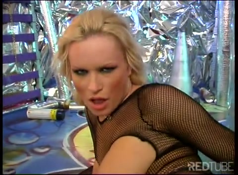 Bitch in fishnet bodystocking works her pussy