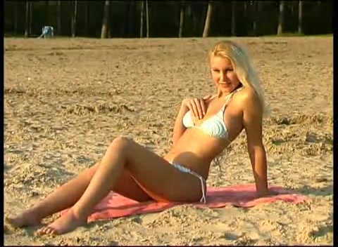 Симпатичная блондинка раздевается на пляже