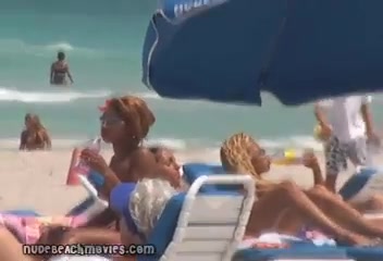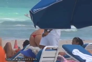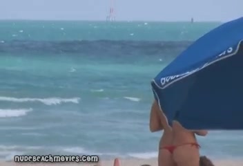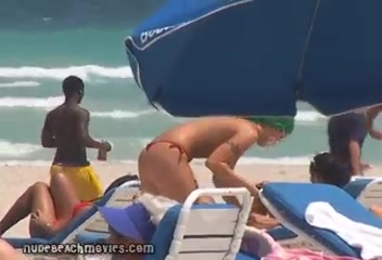 Жёлтые стринги пляжной девочки загорающей топлесс