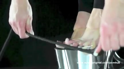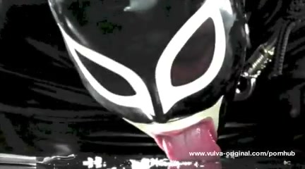Рабыня в маске и латексном костюме вылизывает ноги своей госпоже