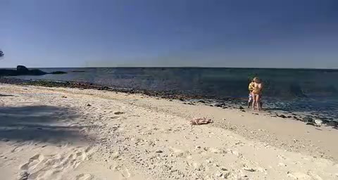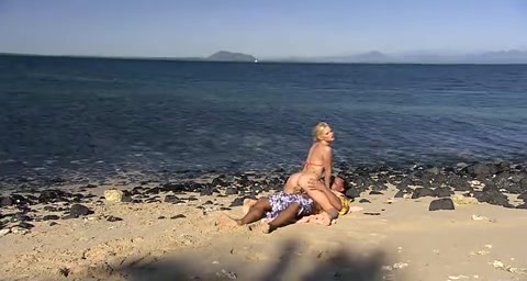 Мужик ебёт на пляже аппетитную молодую блондинку с большой грудью