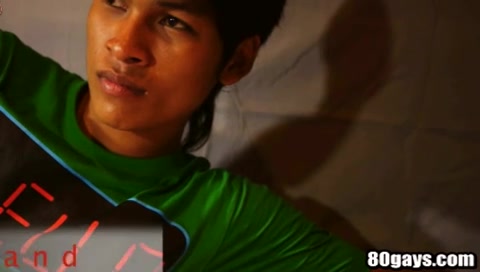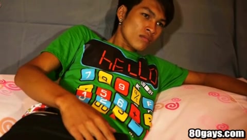 Азиатский гей с татуировкой раздевается на кровати и дрочит член