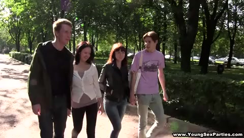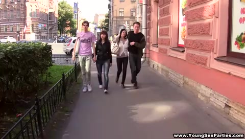 Парни гуляют с двумя русскими девушками и трахают их на квартире