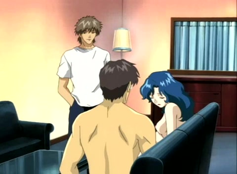 Девка с голубыми волосами занимается сексом с мужчиной и парнем