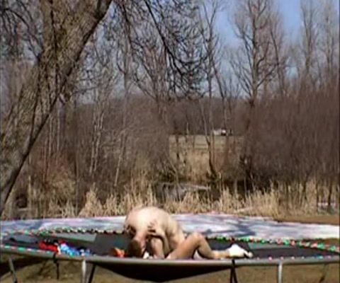 Голая девчонка на улице прыгает на батуте и трахается с приятелем