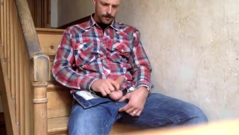 Голубой папочка на лестнице дрочит свой член и слизывает сперму
