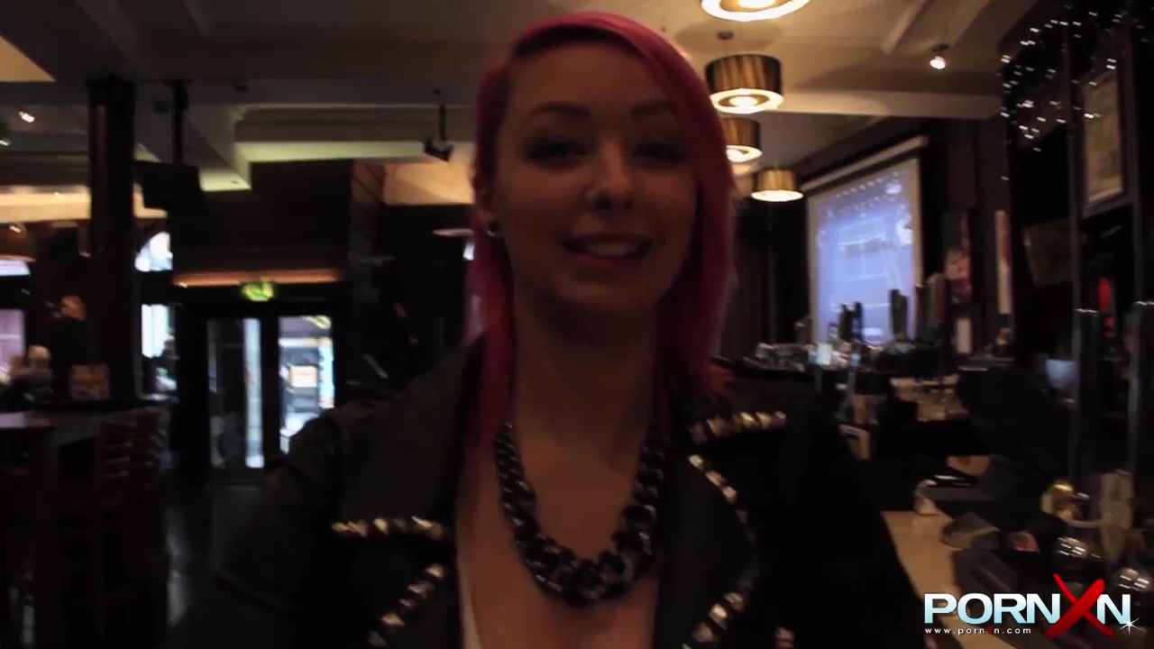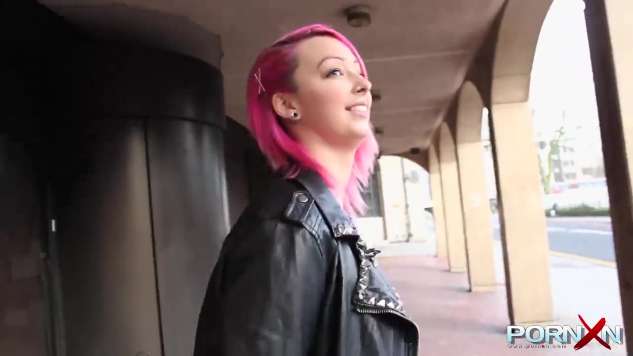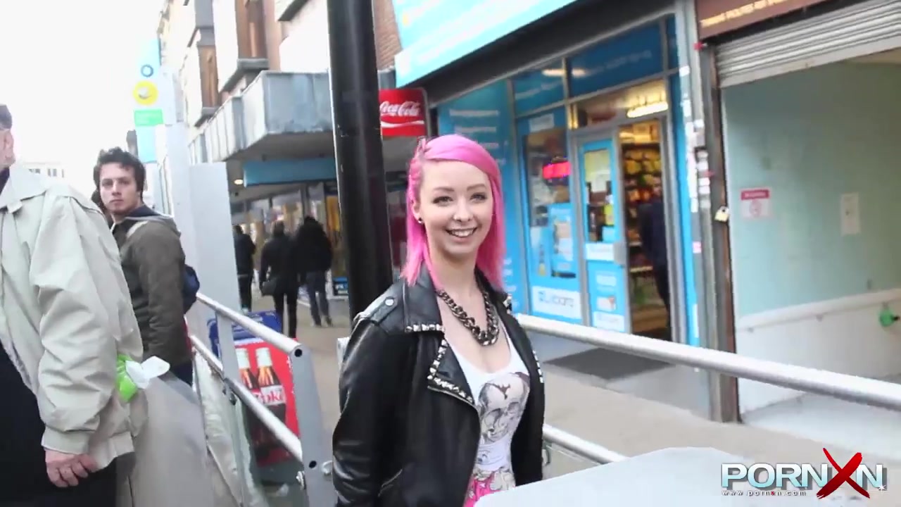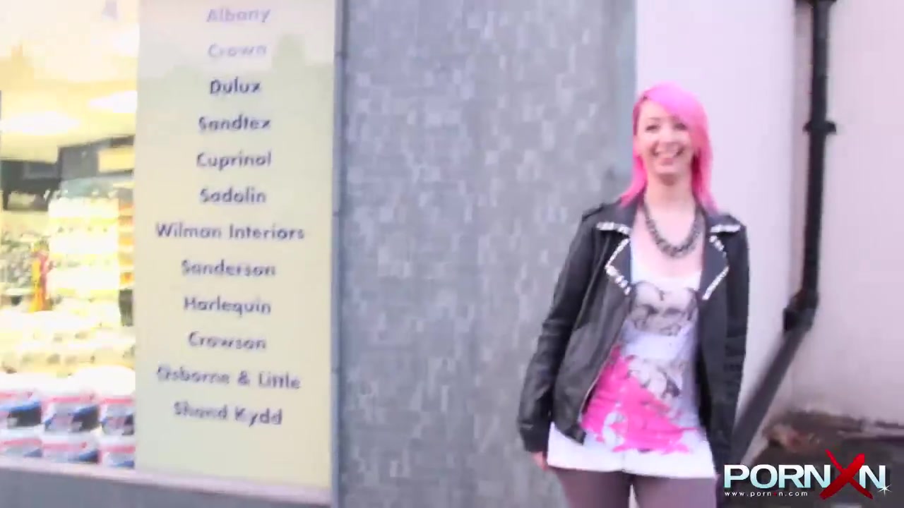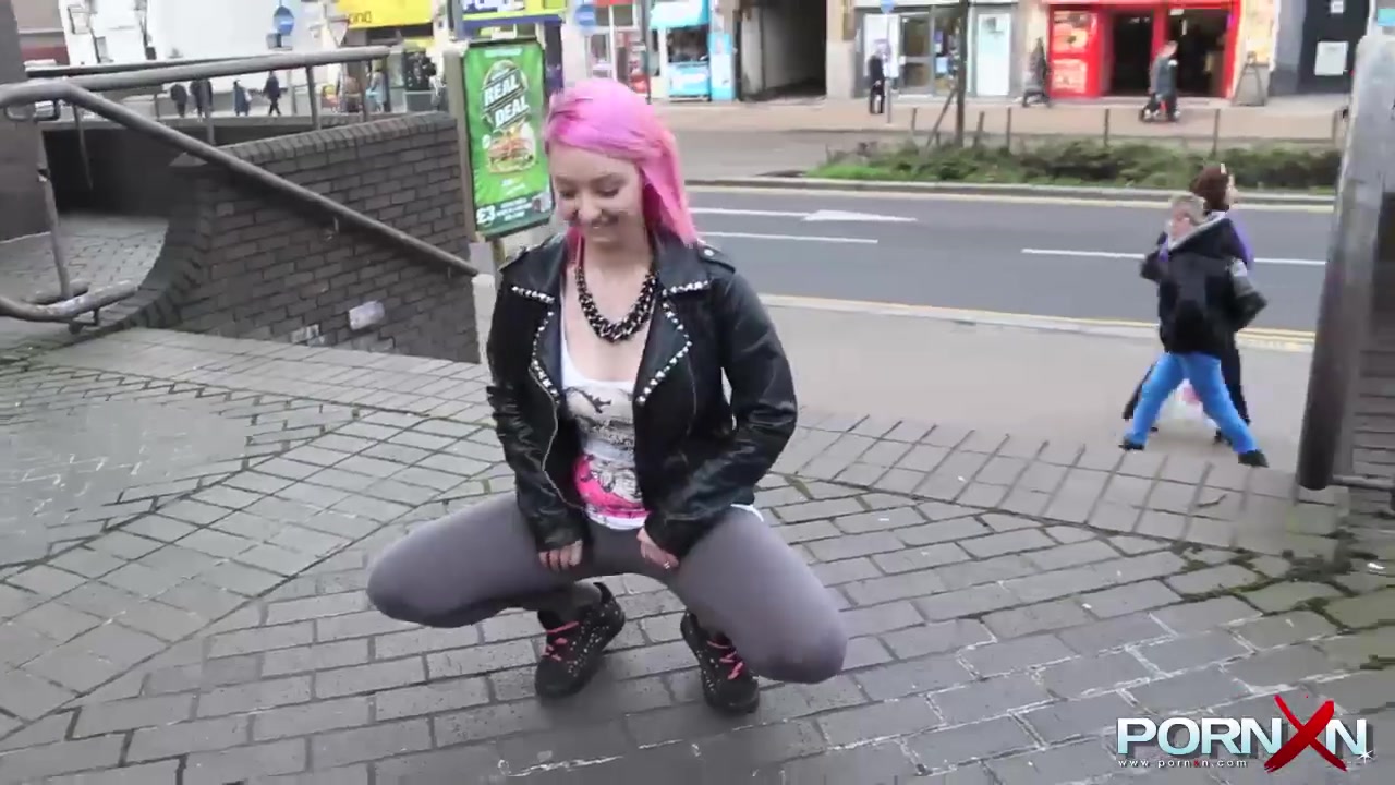 Девка с розовыми волосами Dolly Kitten писает в публичных местах