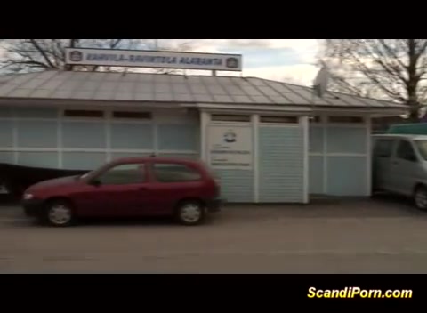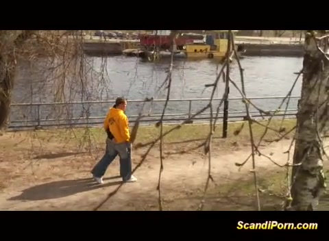 Брюнеточка отсасывает и дрочит член приятелю на лестнице у реки
