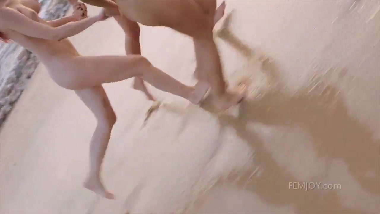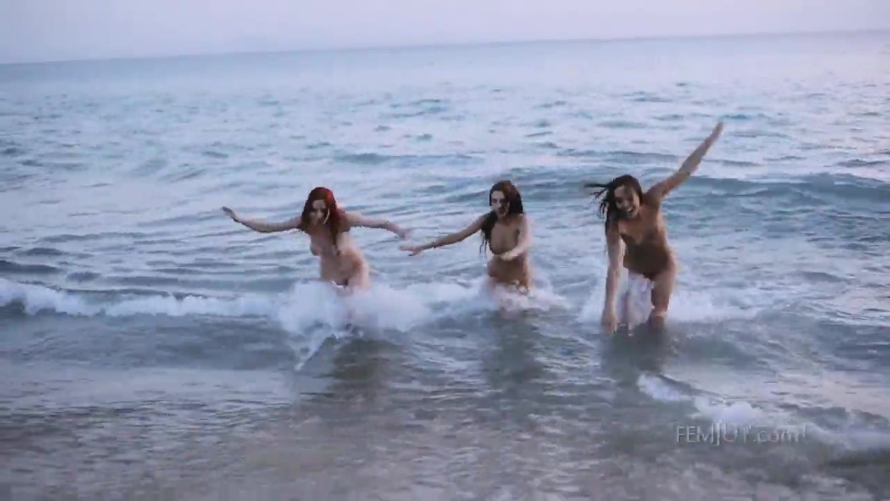 Три голые молодые лесбиянки купаются и загорают на диком пляже