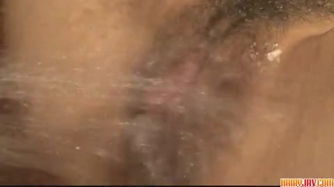 Мокрая азиатская девчонка ласкает руками свою волосатую киску