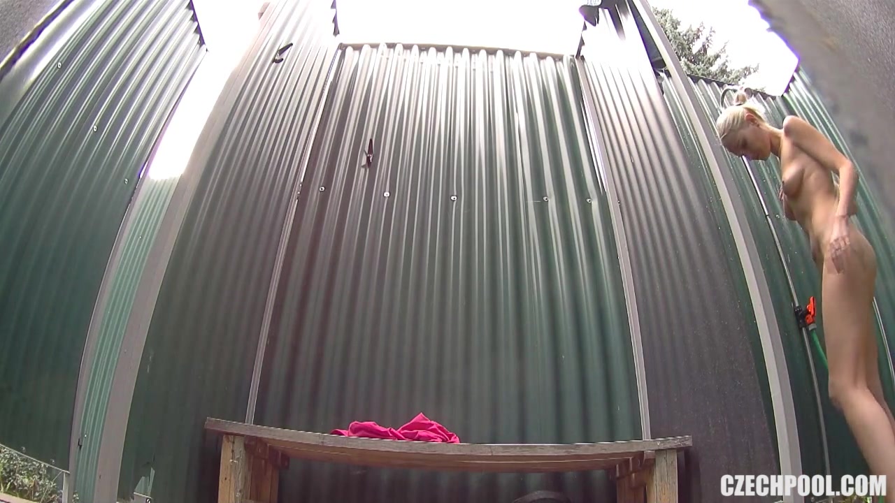 Худая чешская женщина раздевается и моется в душевой кабинке