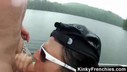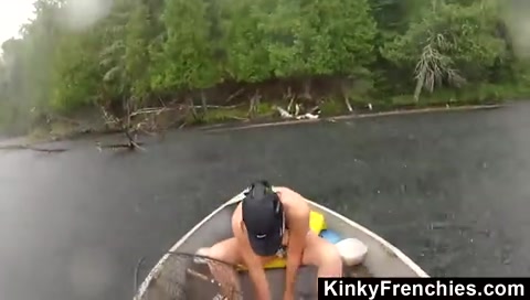 Девушка с обнажёнными сиськами делает минет в лодке на рыбалке