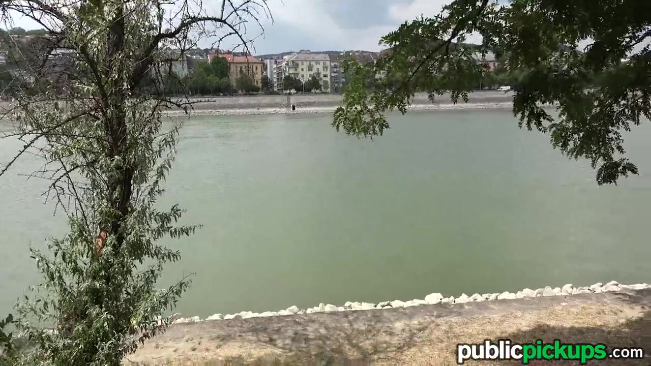 Девка показывает сиськи и отсасывает парню член на берегу канала