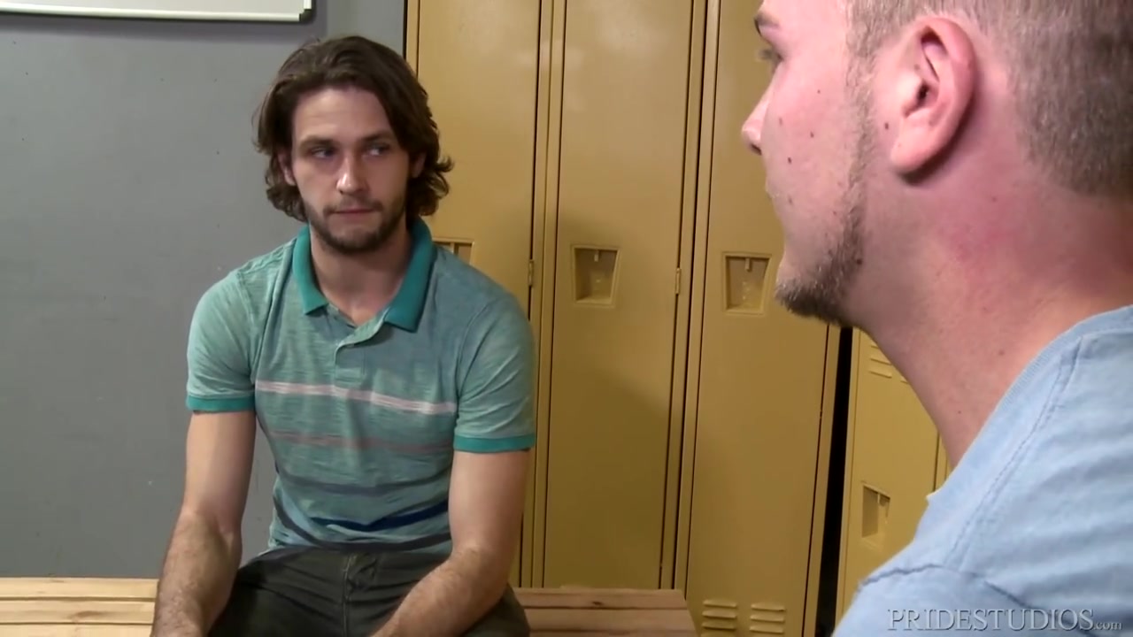 Молодой гей в раздевалке отсасывает другу хуй и подставляет зад