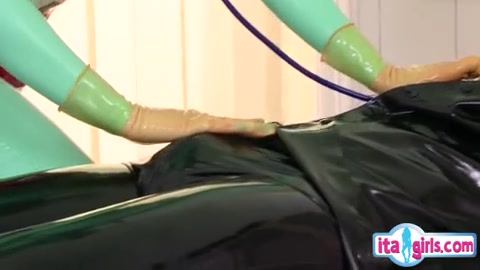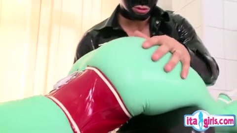 Медсестра в зелёном латексном костюме ебётся с пациентом в чёрном