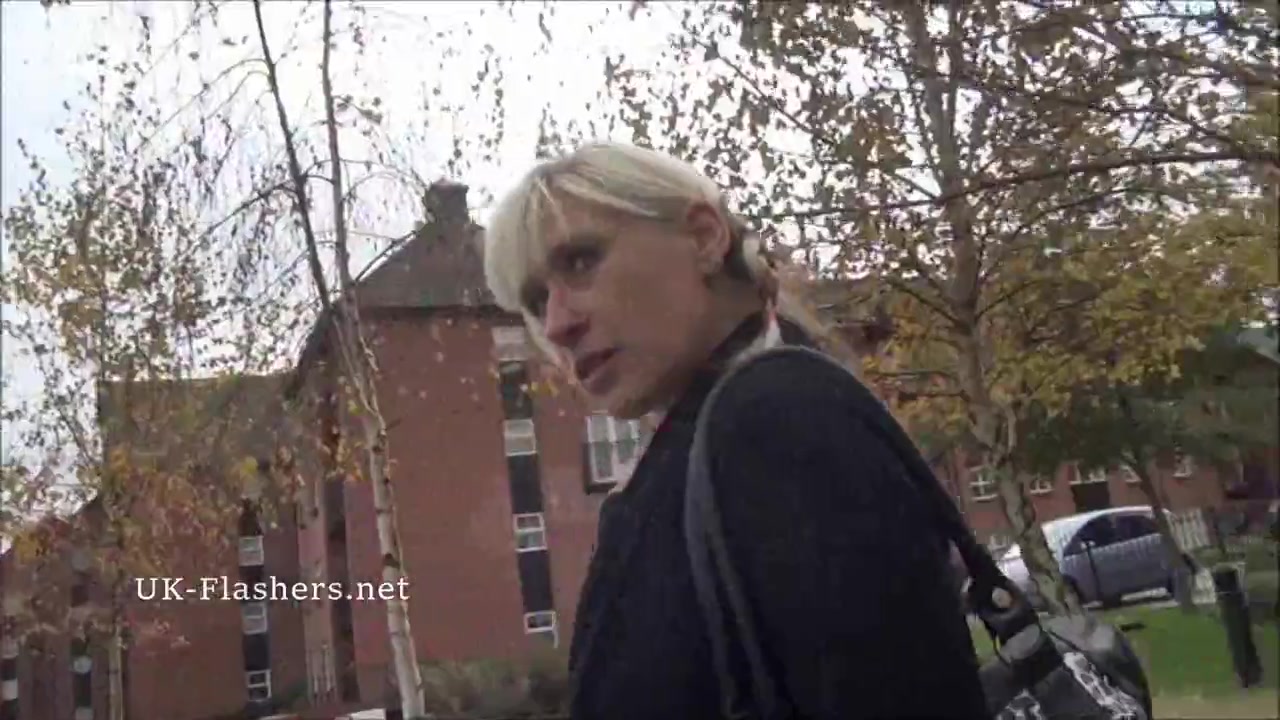 Блондинка эксгибиционистка показывает сиськи и выбритую киску