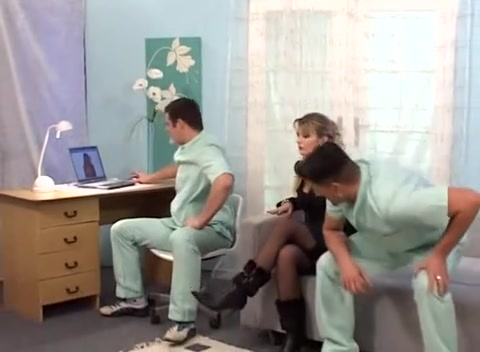 Похотливые доктора вдвоём отъебали пациентку в чёрных чулках