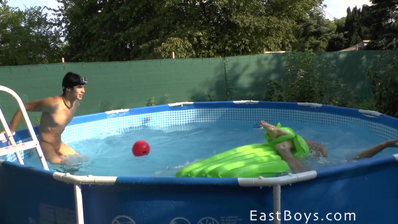 Двое голубых парней летом купаются голышом в открытом бассейне