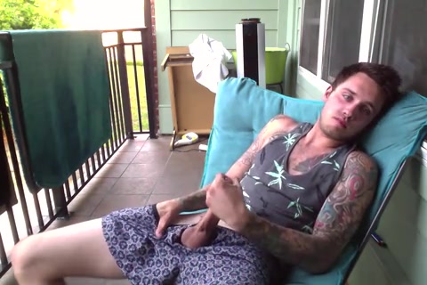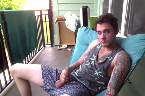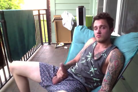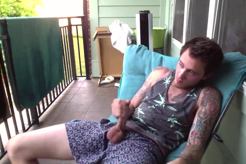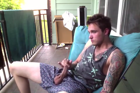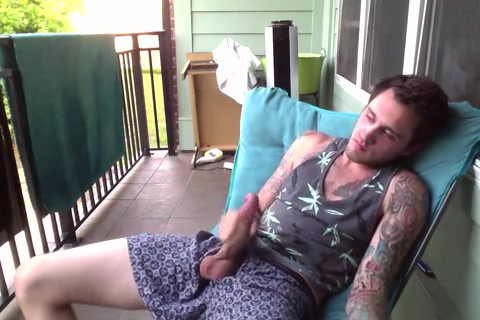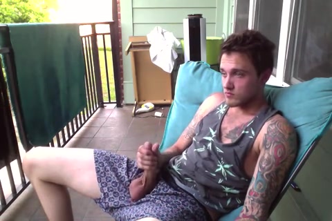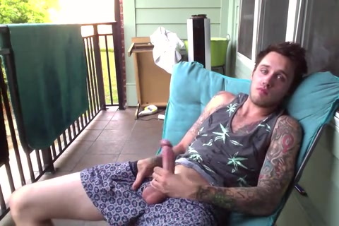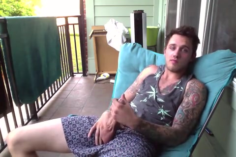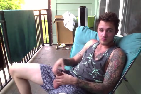 Симпатичный молодой гей с татуировками дрочит член на балконе