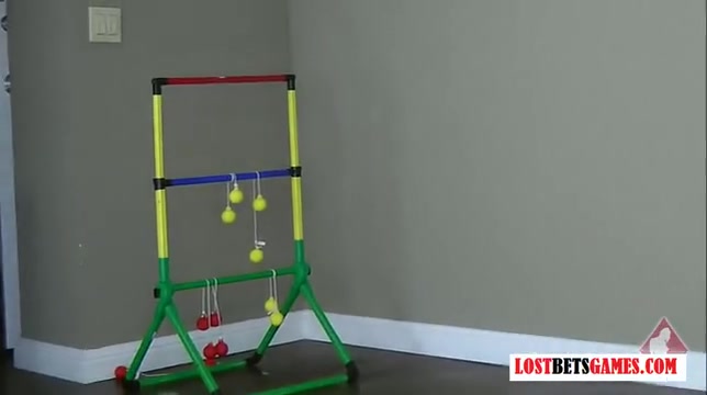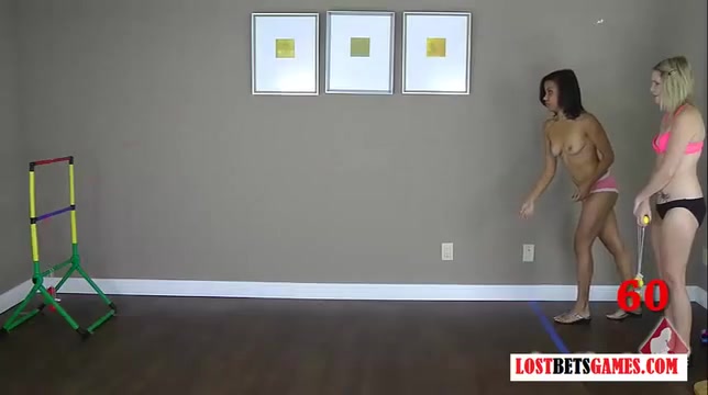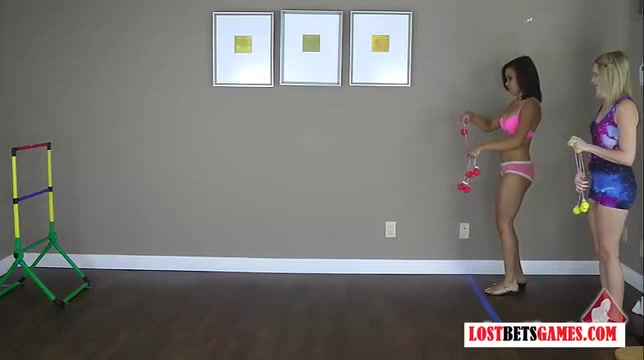 Две молоденькие лесбиянки играют с мячами и раздеваются догола