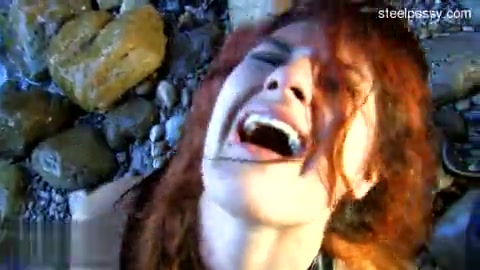 Мужик ебёт привязанную к камню рыжую рабыню в сетчатых чулках