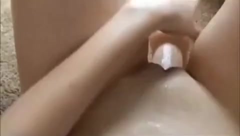 Девушка вставляет фаллос в свою гладко выбритую киску и снимает