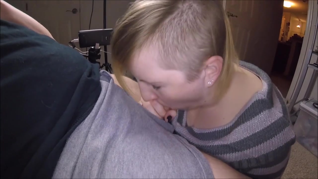 Блондинка делает бойфренду минет и даёт кончить на бритый лобок