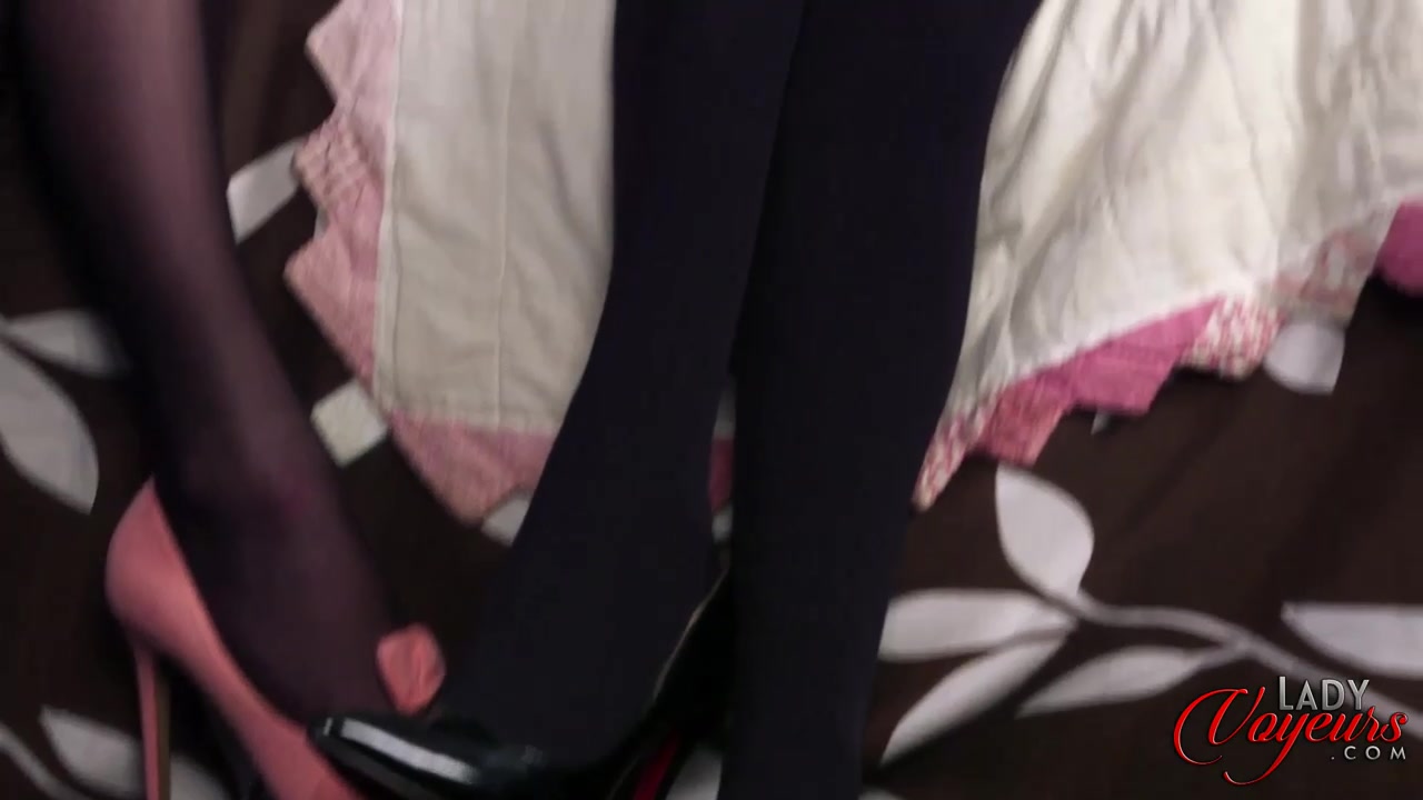 Сексуальная блондинка в очках и её подружка шатенка раздеваются до нижнего белья и возбуждают мужчину своими формами. Мужчина снимает трусы и дрочит на двух красивых девушек в чулках и нижнем белье.
