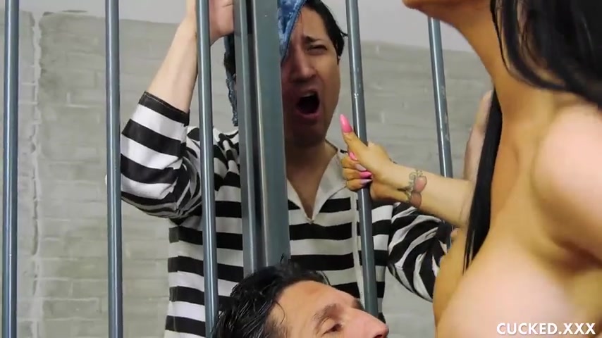 Грудастая брюнетка ебётся с охранником на глазах у заключённого