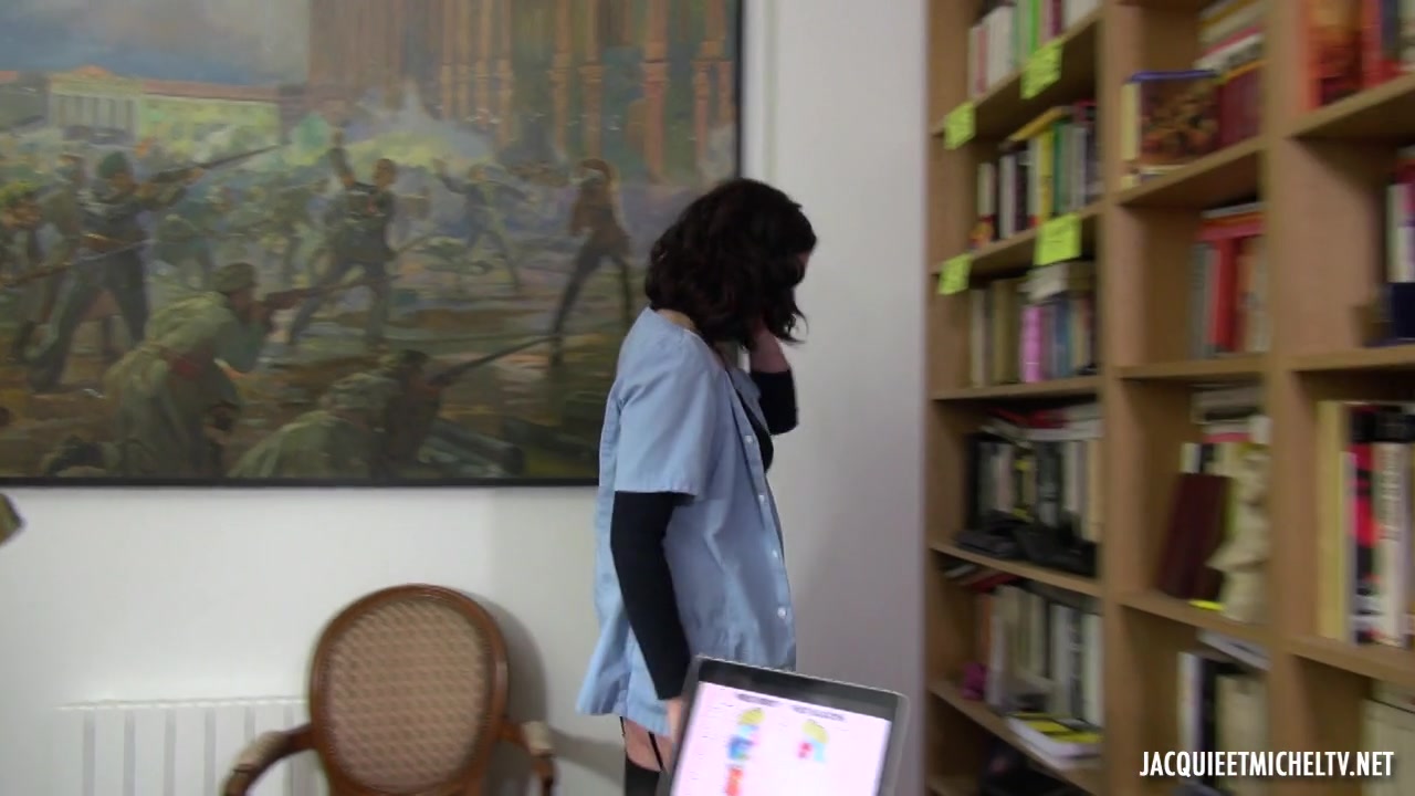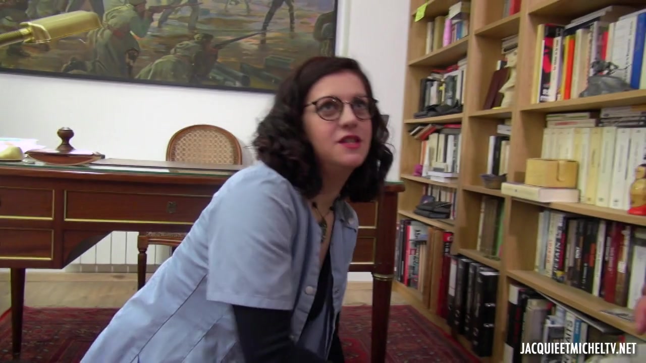 Мужчина зашёл в библиотеку и встретил там сексуальную француженку в очках и чёрном нижнем белье. Шатенка сняла свои чёрные трусики и сделала мужику минет. После минета мужчина сделал куни и оттрахал девушку на её рабочем столе. Пока мужчина ебал библиотекаршу в анал, она трахала себя вибратором в киску. Оттраханная во все дыры девушка получила сперму на лицо.