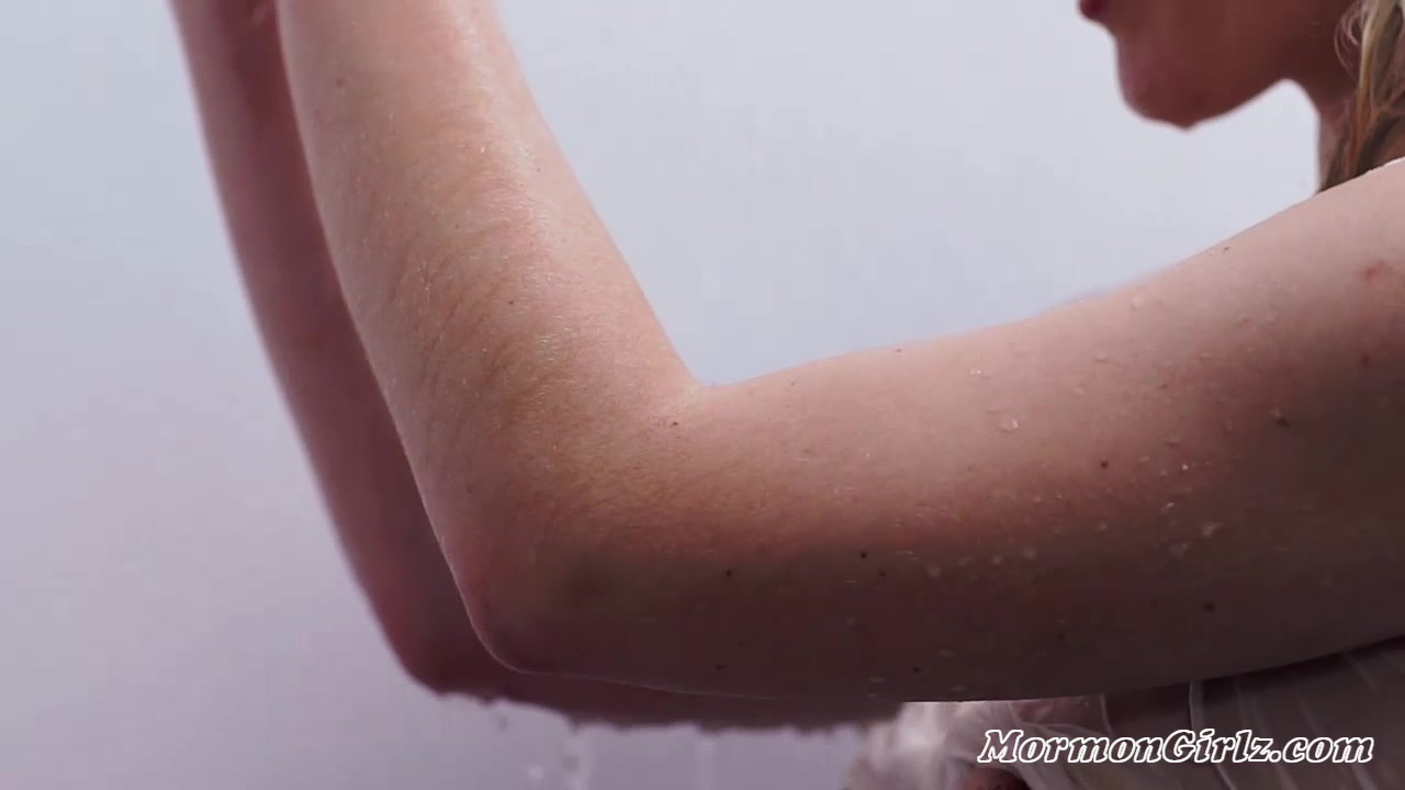 Юная блондинка принимает горячий душ в белом нижнем белье. Она намыливает своё молодое тело шампунем и ласкает себя руками. Перевозбуждённая девушка интенсивно трёт бритую письку и засовывает в неё белые панталоны. Блондиночка делает себе вагинальный фистинг и громко стонет во время оргазма.