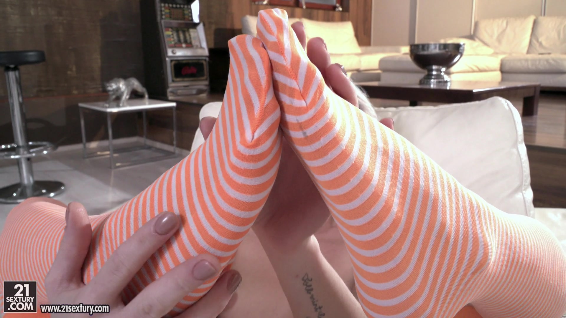 Симпатичная молодая блондиночка любительница пирсинга Zazie Skymm раздевается догола и примеряет полосатые гольфы. Это возбуждающее действо замечает её молодой человек и начинает целовать девушке ноги. Затем красотка снимает с парня брюки и дрочит его член ногами. Молодой человек ебёт блондиночку в анал и делает ей анилингус. После горячего анального секса парень заливает спермой ступни девушки.