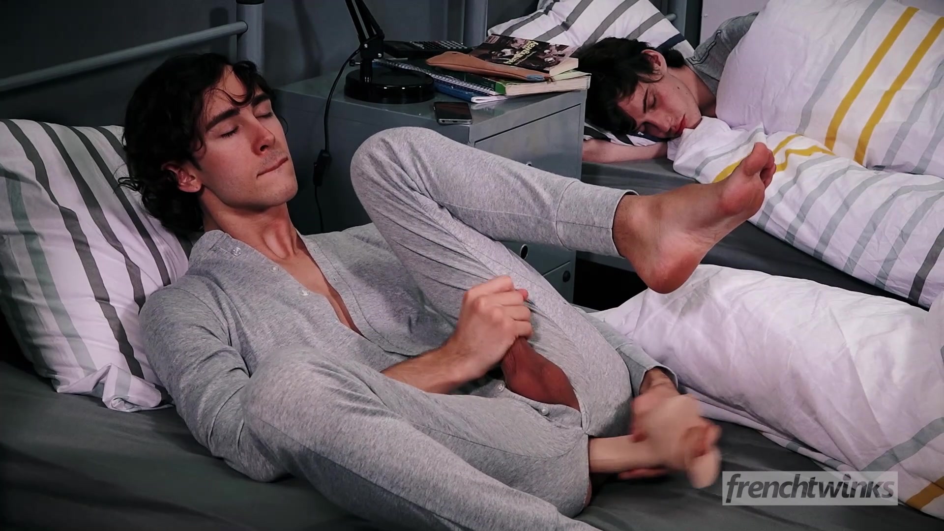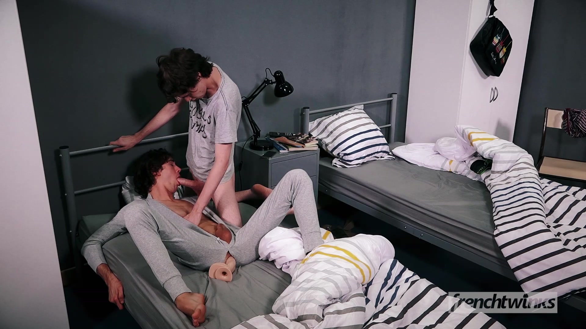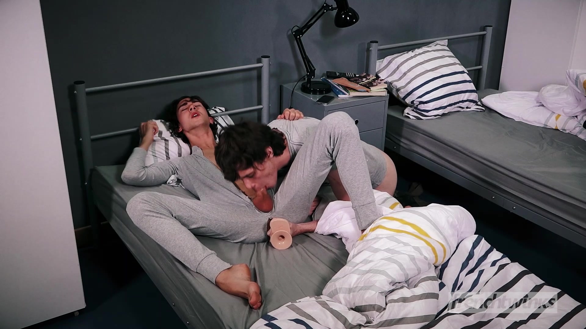 Два молодых гея спали на соседних кроватях в одной комнате и один из парней ночью мастурбировал свой член. Второй парень проснулся и увидел, чем занимается его сосед по комнате. Он сделал ему минет и оттрахал фаллосом в разработанное очко. Парни отсосали друг другу члены и сделали анилингус, а потом трахались в очко. Оба голубых парня довели себя до семяизвержения.