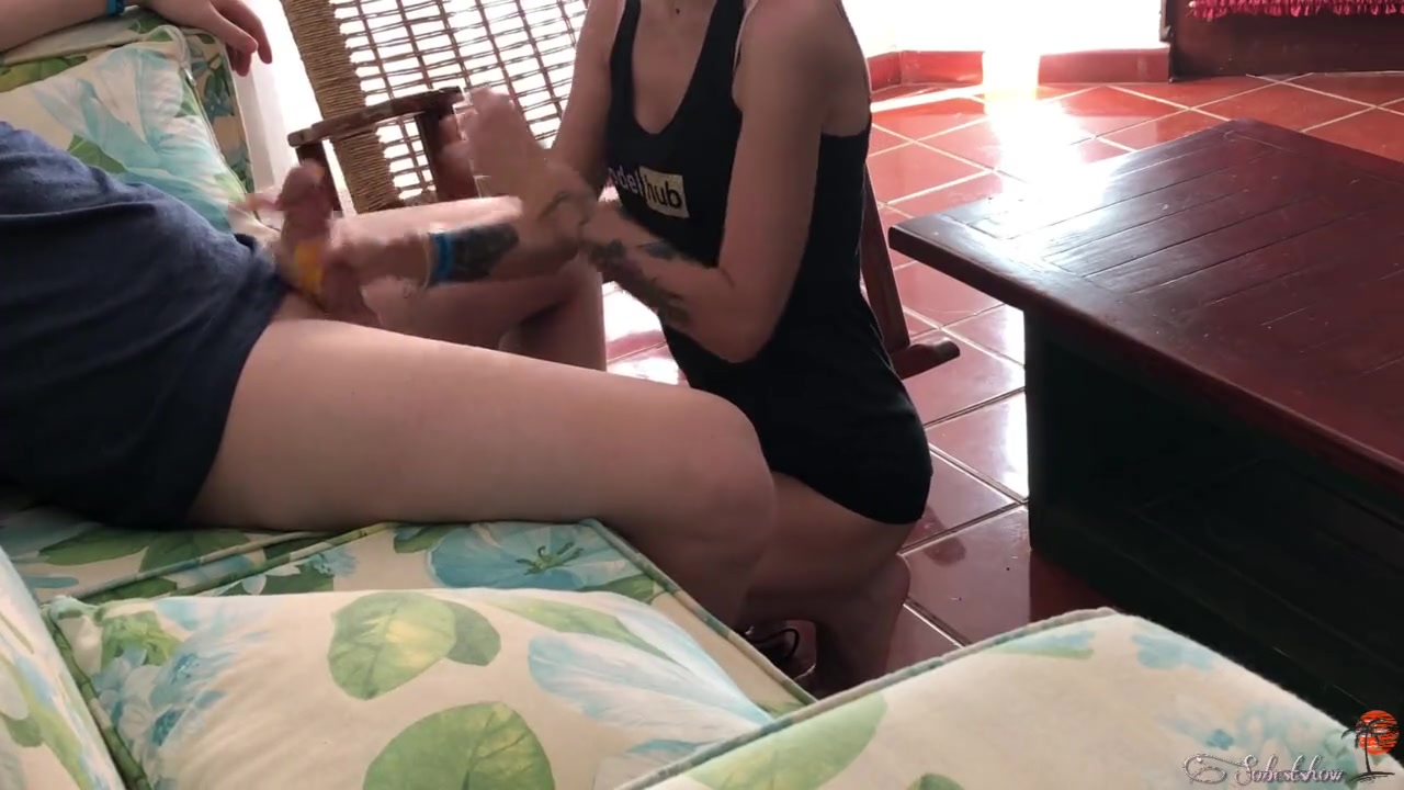 После прогулки по тропическому пляжу молодая русская блондинка с тату на руках Freya Stein пришла в свой номер и стала дрочить бойфренду член. Худая красотка сделала парню глубокий минет и залезла на большую кровать. На кровати девушка дала подрочить клитор и подставила киску под член. Бойфренд отодрал подружку во влагалище и заполнил его спермой.
