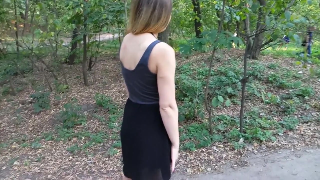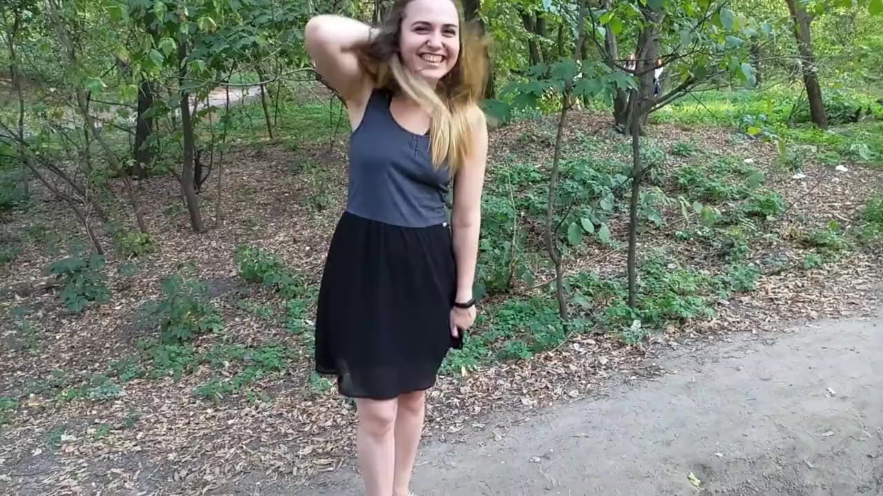 Во время прогулки по городскому парку светловолосая русская девчонка сняла с себя чёрные кружевные трусики и зашла с парнем в кусты. Девушка задрала короткую юбчонку и дала парню подрочить свою розовую киску. Молодой человек отлизал девушке клитор и довёл её до оргазма в общественном парке.
