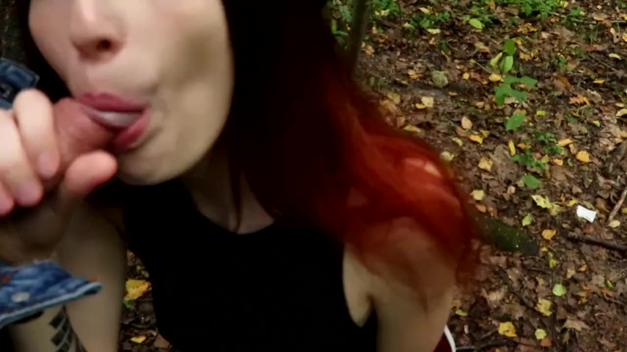 Паренёк шёл по лесной тропинке вслед за рыжей русской девчонкой, которая дразнила его своей аппетитной задницей. Худая татуированная бесстыдница трясла попой перед парнем и в конце концов сняла с себя чёрные стринги. Потом девка встала на колени и стала отсасывать у парня член. После отсоса парень поставил тёлку раком и оттрахал возле берёзы. Оттрахав девку у дерева, парень подрочил член и кончил на её побритую письку.