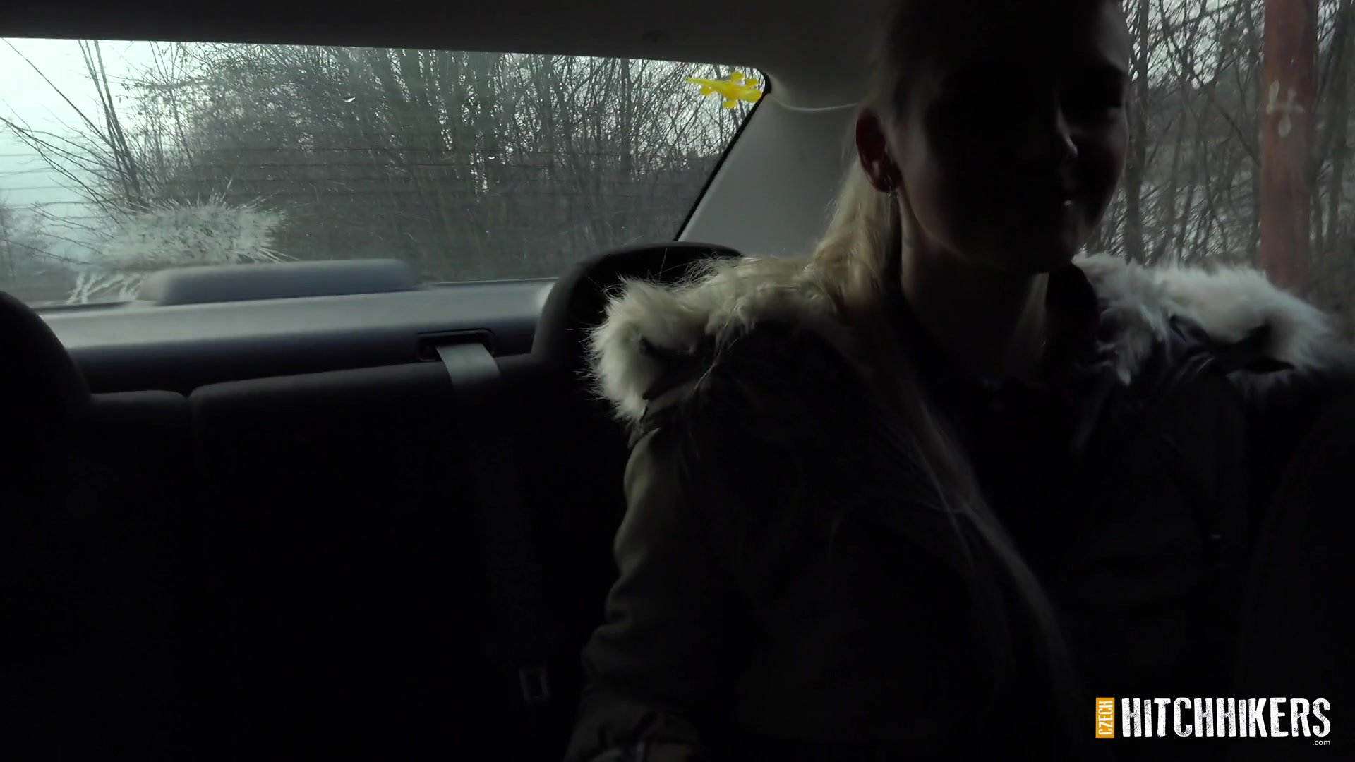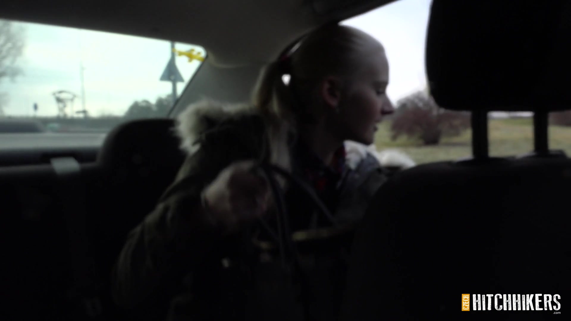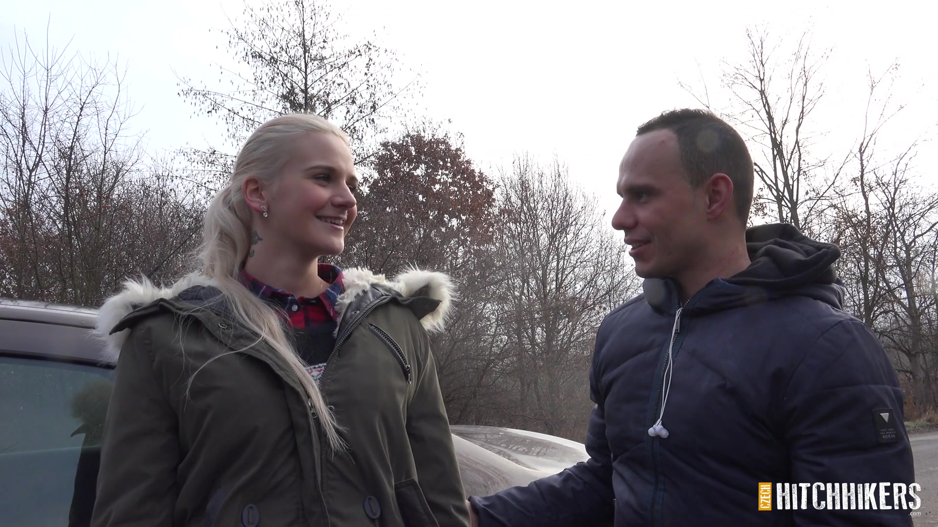 Водитель подобрал на трассе молодую чешскую блондинку Katy Sky и привёз её в ближайший лес. Остановившись на обочине, парень сделал девушке куни и дал отсосать член. Потом он оттрахал развратную девчонку возле шоссе под удивлёнными взорами проезжающих водителей. После ебли в лесу на свежем воздухе, парень кончил девке в рот.