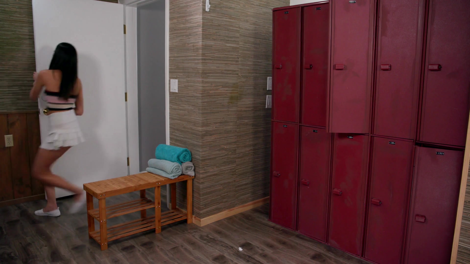 Юная шатенка-лесбиянка Emily Willis спряталась за шкафчиком в женской раздевалке и увидела голую сиськастую блондинку Serene Siren. Светловолосая женщина заметила девчонку и заставила отлизать свой клитор. Девушка сделала милфе куни и стала с ней целоваться и тереться сиськами. Затем зрелая лесбиянка отлизала у девчонки киску и оттрахала её в позе ножницы.