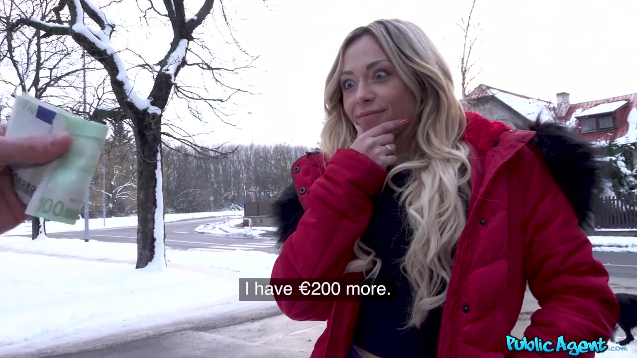 Пикапер встретил на улице заблудившуюся французскую блондинку Jennifer Amilton и предложил ей деньги за секс. 23-летняя девушка охотно согласилась и даже оголила свою аппетитную попу на улице. Она пошла к парню домой и сделала ему минет, после чего возбуждённый пикапер отодрал эту татуированную шлюшку на диване. Отодрав француженку в разных позах, парень забрызгал её лицо спермой.