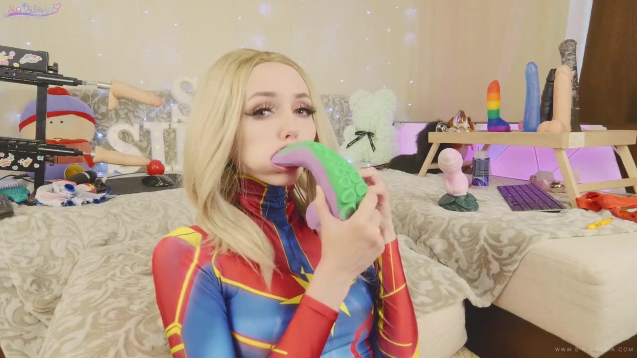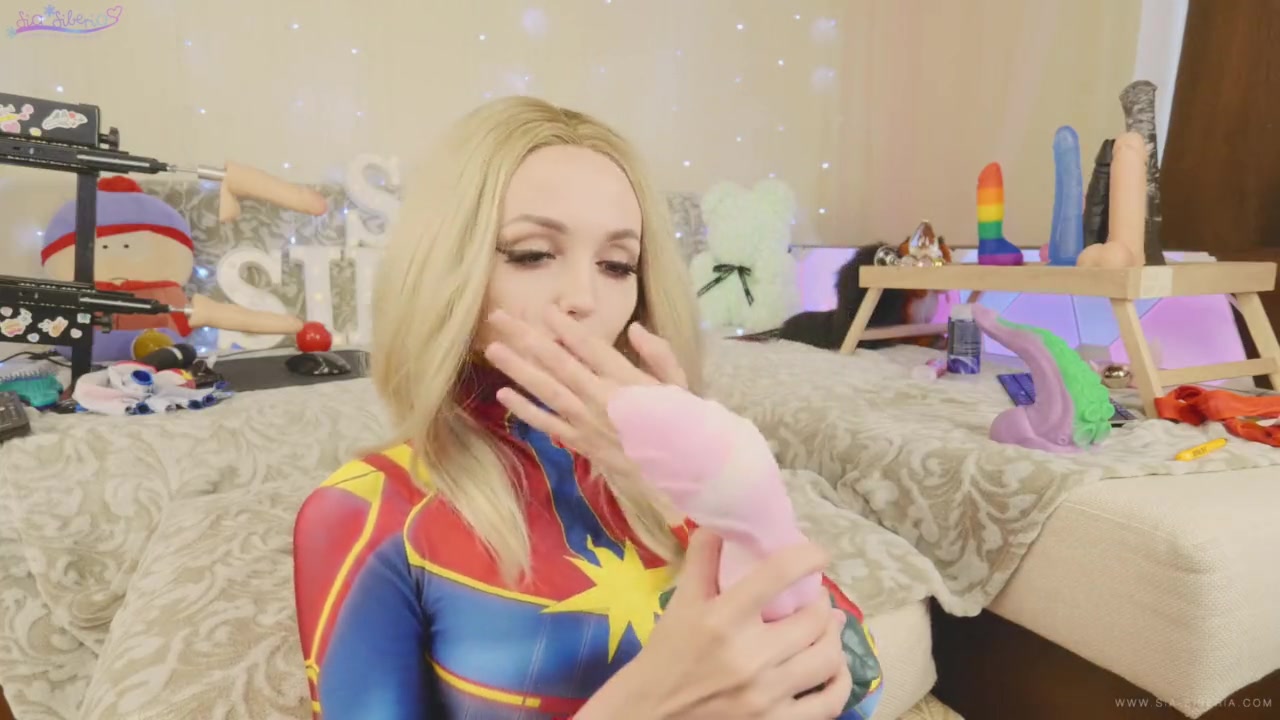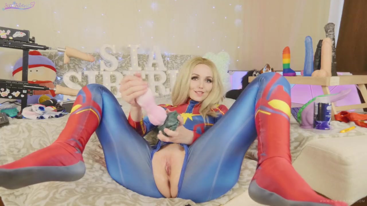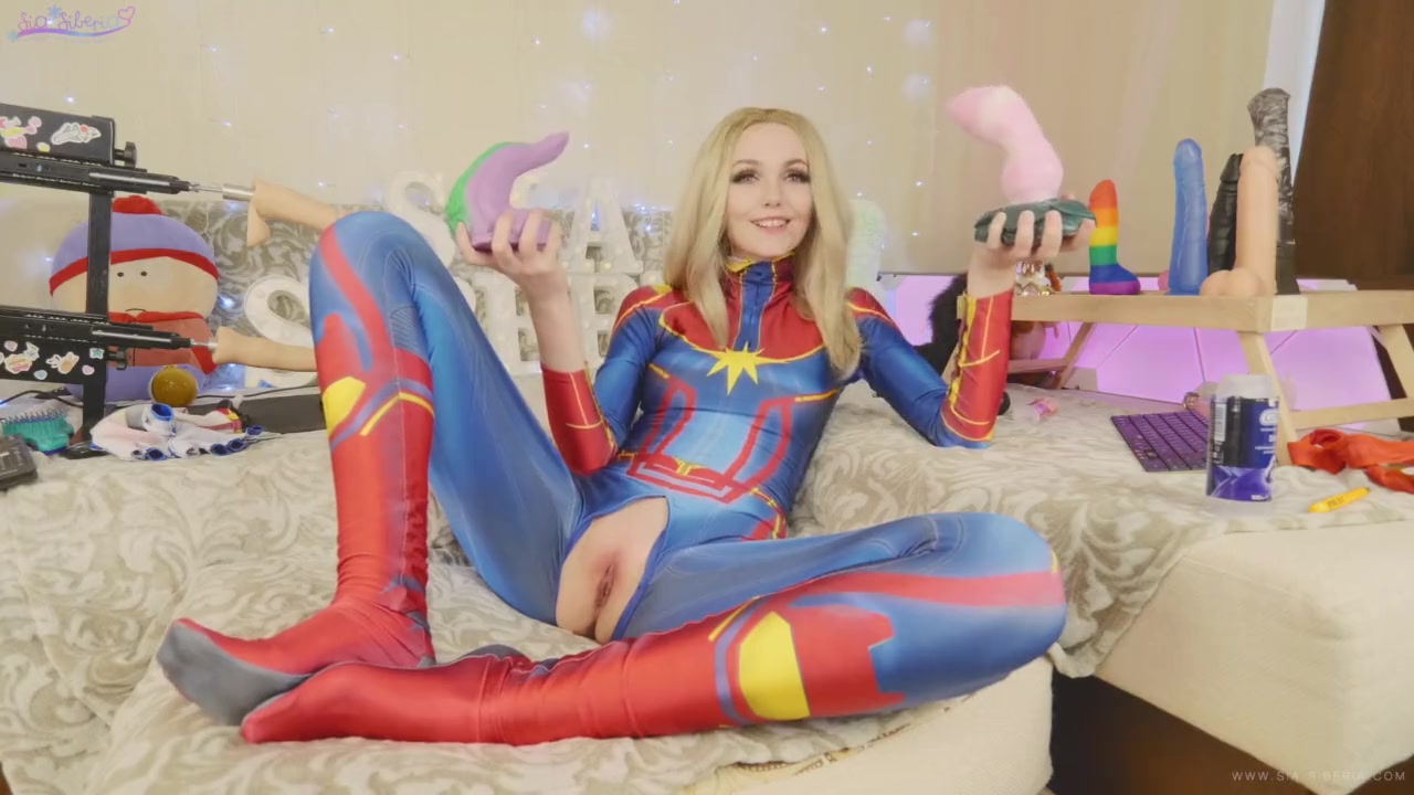 Светловолосая русская красавица, любительница косплея Siasiberia, надевает костюм Капитана Марвел и расстёгивает молнию в районе промежности. Игривая девушка отсасывает фаллические игрушки и вставляет их в свою чисто побритую письку. Она трахает себя секс игрушками и мастурбирует клитор большим вибратором.