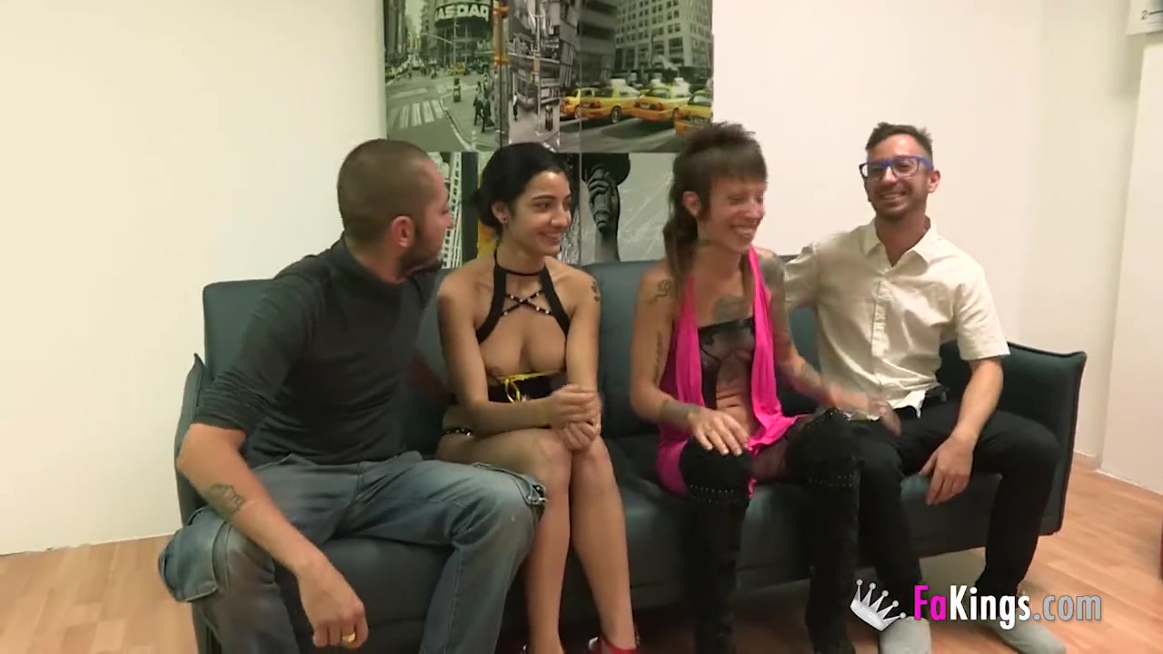 Две молодые испанские пары собрались на свинг вечеринку и занялись групповым сексом вчетвером. Татуированная шатенка и грудастая брюнетка разделись и стали отсасывать у парней члены. Свингеры бешено трахались на кровати и менялись партнёрами во время ебли. Страстная испанская свинг групповушка завершилась семяизвержениями на животы девушек.