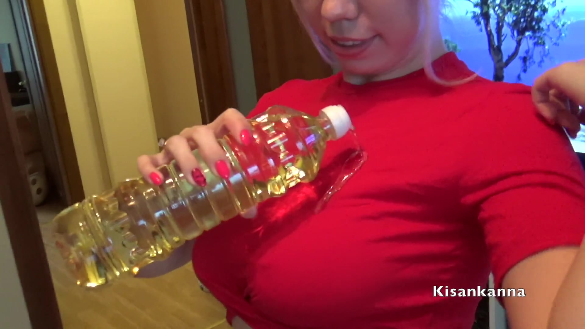 Светловолосая русская подруга Kisankanna, облила себя подсолнечным маслом и занялась мастурбацией сидя на полу. За этим делом грудастую тёлку застал её бойфренд и дал ей отсосать свой возбуждённый пенис. Девушка сделала минет и подрочила член сиськами и ногами, после чего была оттрахана в бритую киску и заполнена спермой.