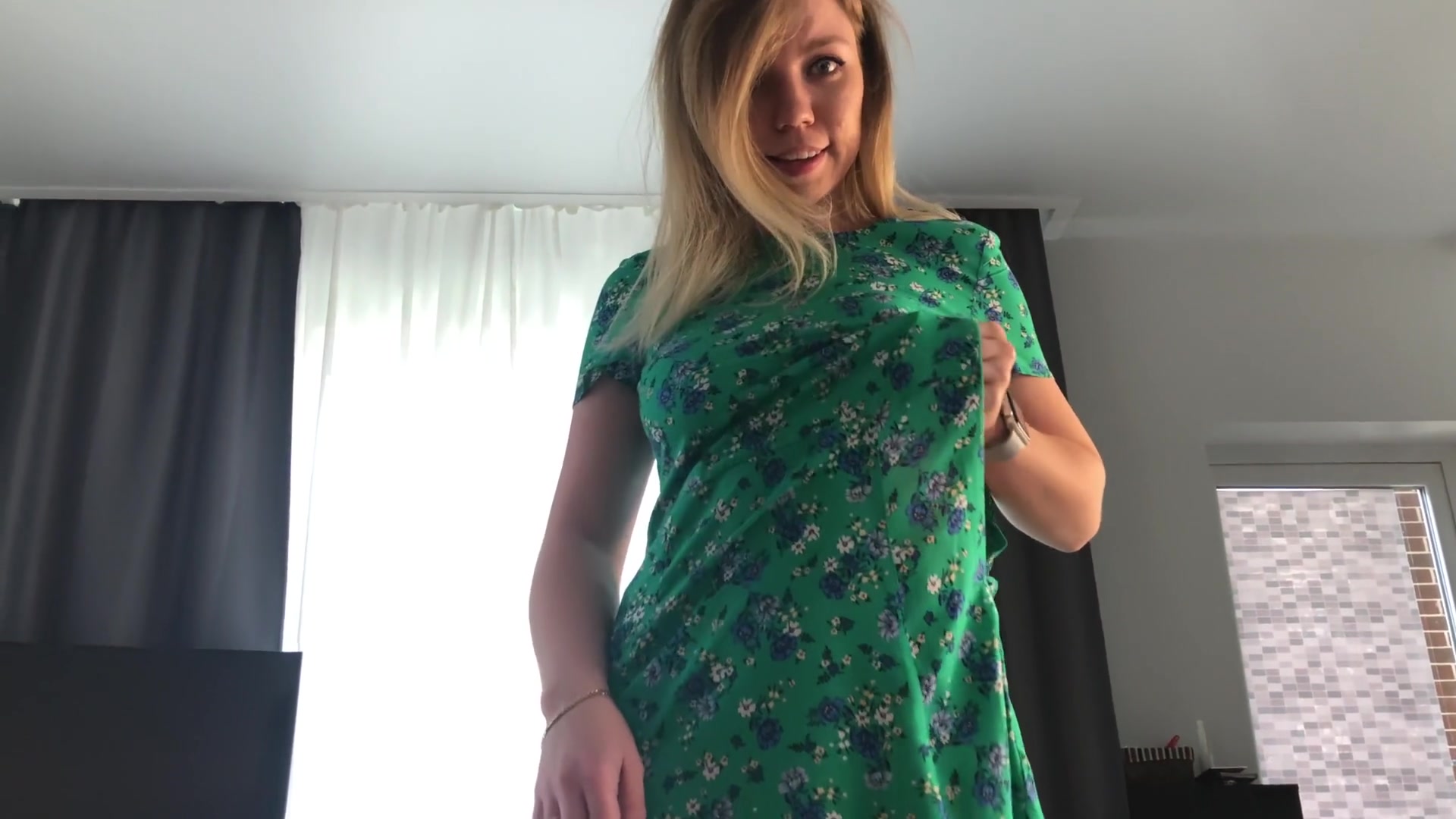Светловолосая русская красотка с большой натуральной грудью Kisankanna, красуется перед парнем в новом платье. Затем она подходит к бойфренду и задирает платье показывая, что на ней нет трусиков. Возбудив приятеля своей сексуальной фигуркой, юная красотка становится на четвереньки и начинает отсасывать член. Девка делает мастурбирующему парню анилингус, этим доводя его до мощного семяизвержения.
