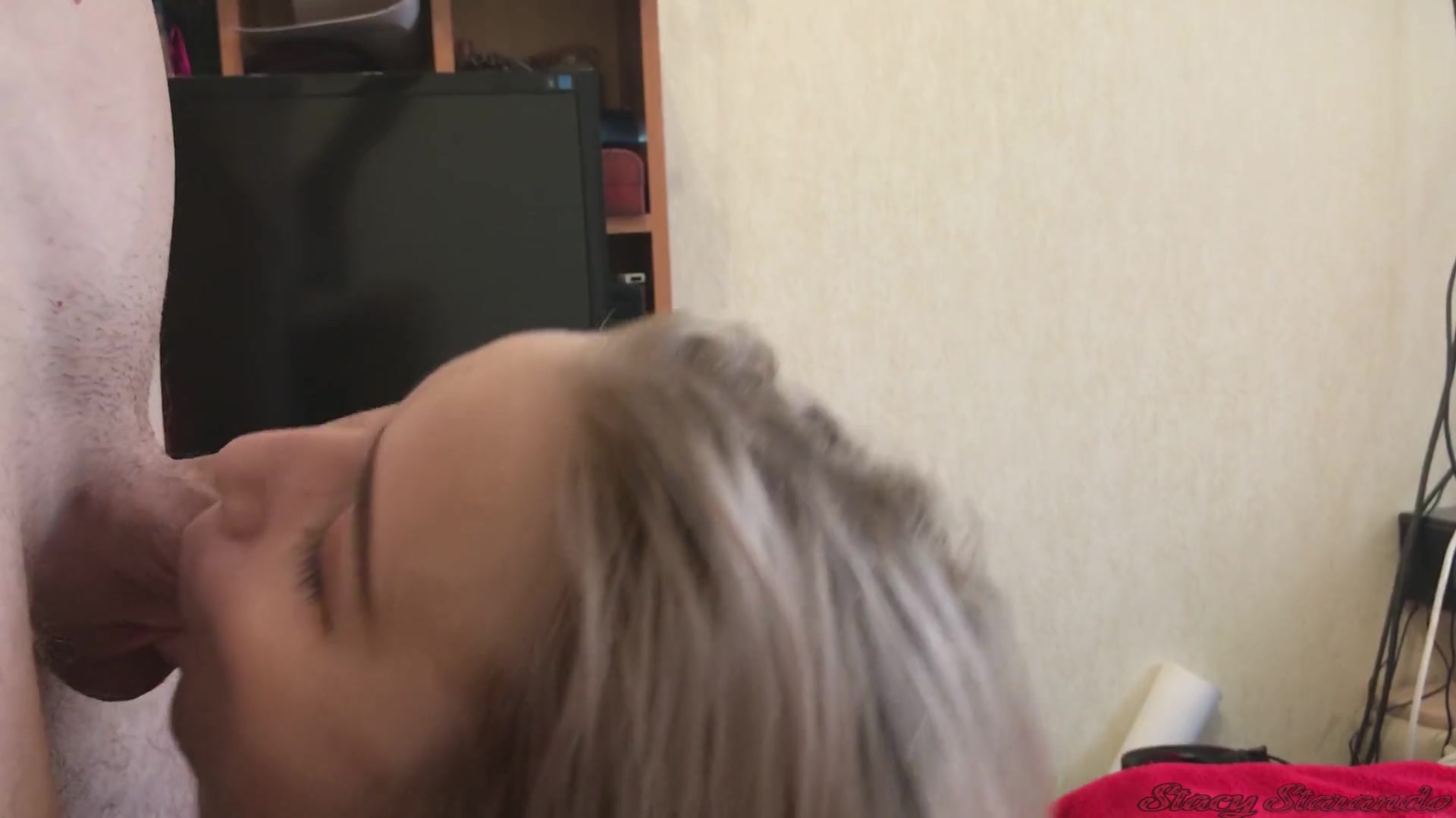 Светловолосая русская девушка Stacy Starando, склоняется к возбуждённому члену своего бойфренда и тщательно его облизывает. Симпатичная блондинка старательно сосёт головку члена и дрочит его своей нежной рукой. Сделав счастливому приятелю роскошный минет, девушка получает сперму в свой рабочий ротик.