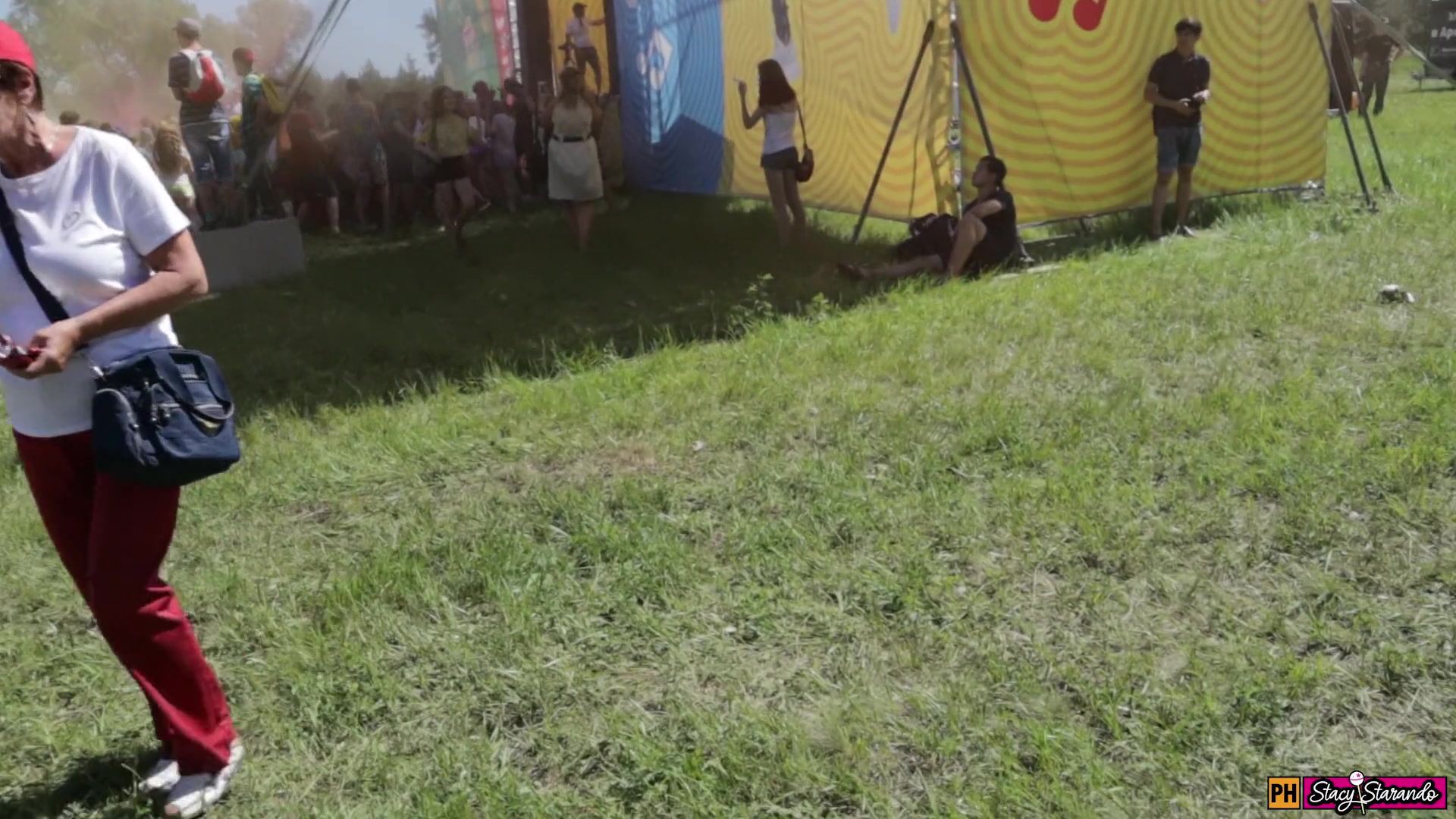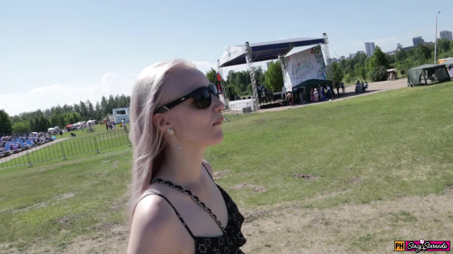 После шумного массового мероприятия не свежем воздухе, молодая русская блондинка Stacy Starando, повела возлюбленного в ближайшую лесополосу и там начала делать минет. Бесстыжая девчонка отсасывала и дрочила член, в непосредственной близости от массовых гуляний. Она сделала минет среди лесной листвы и получила сперму в рот.