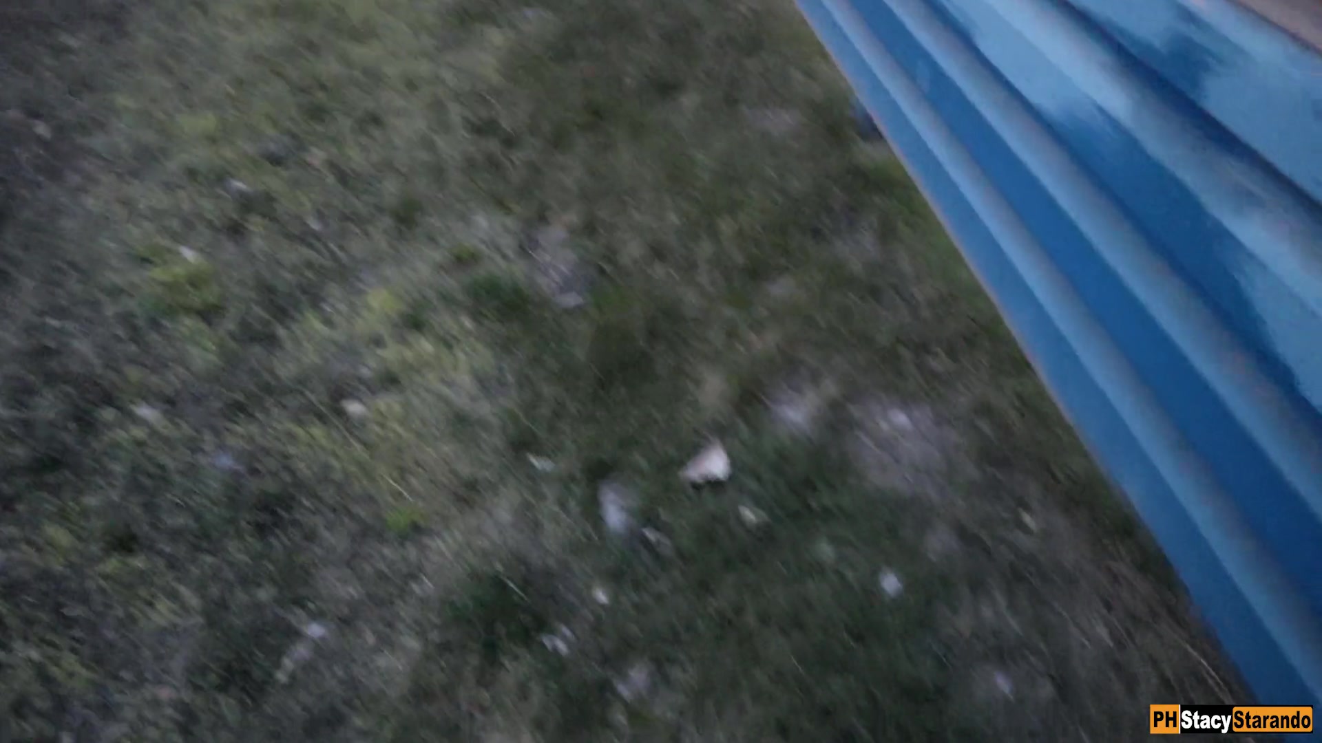 Светловолосая русская девчонка в сетчатых чулках Stacy Starando, во время прогулки с парнем, снимает чёрные трусики и начинает тереть свою бритую письку возле забора. Бесстыжая девица мастурбирует клитор рядом с проходящей электричкой, а затем принимается за член кавалера. Она делает минет на траве и трахается с парнем раком, после чего получает сперму на трусики.