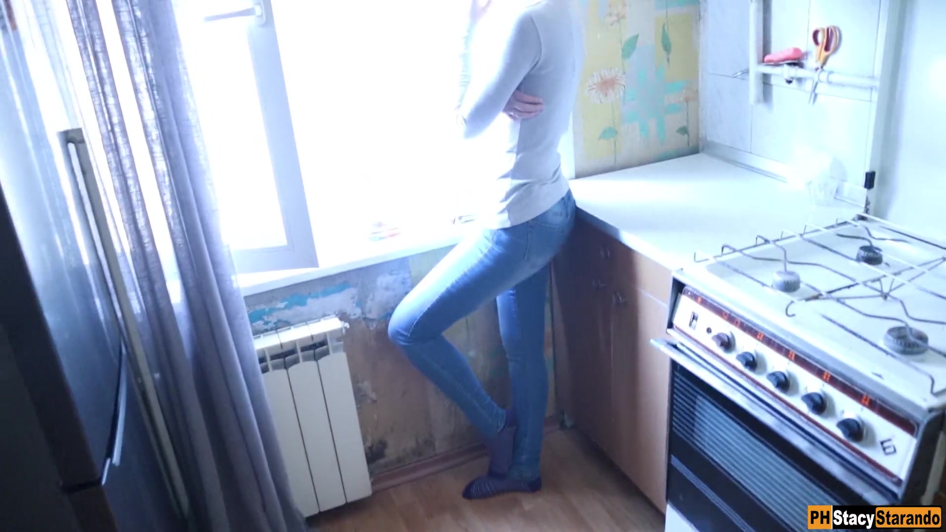Парень подошёл к стоящей у окна молодой русской блондинке Stacy Starando и предложил отсосать у него член. Недолго думая, тёлка согласилась и сняла с парня трусы. Своими умелыми ручками она принялась дрочить и отсасывать вялый член парня. Молодая соска сделала отличный минет и получила сперму на лицо.